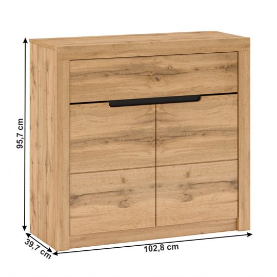 Materiál: DTD laminovaná / MDF fóliovaná Barva: dub Wotan Rozměry (ŠxHxV): 102,8x39,7x95,7 cm Tloušťka materiálu korpus: 16 mm Tloušťka materiálu dvířka: 19 mm dvoudveřová jeden šuplík Dodávané v demontu