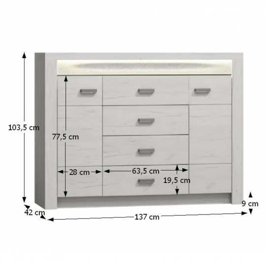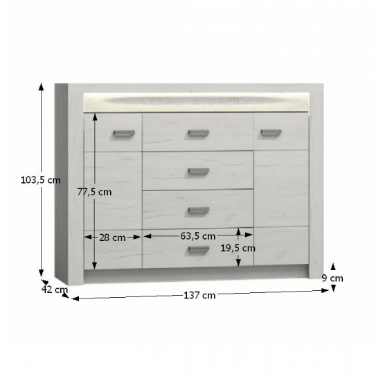 Komoda 07 z luxusního sektorového nábytku. Korpus hrubý až 48 mm, Tloušťka materiálu zbývající části: 16 mm, úchytky kovové Materiál DTD laminovaná, ABS hrany, Barevné provedení: jasan bílý, Rozměry ŠxHxV: 137x42x103,5 cm. Podsvícená deska z masivního dřeva Dodávané bez LED osvětlení Možnost dokoupení LED osvětlení v ceně 1090 Kč. Dodávané v demontu.