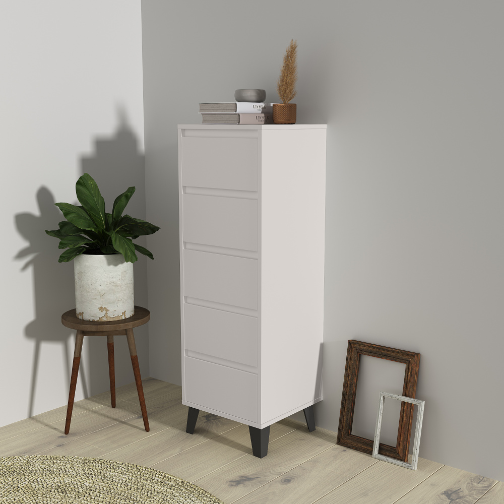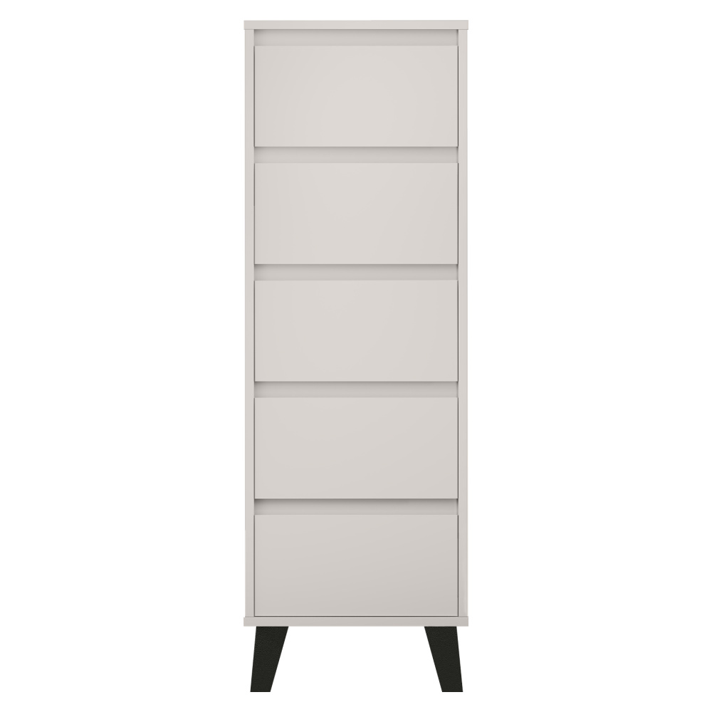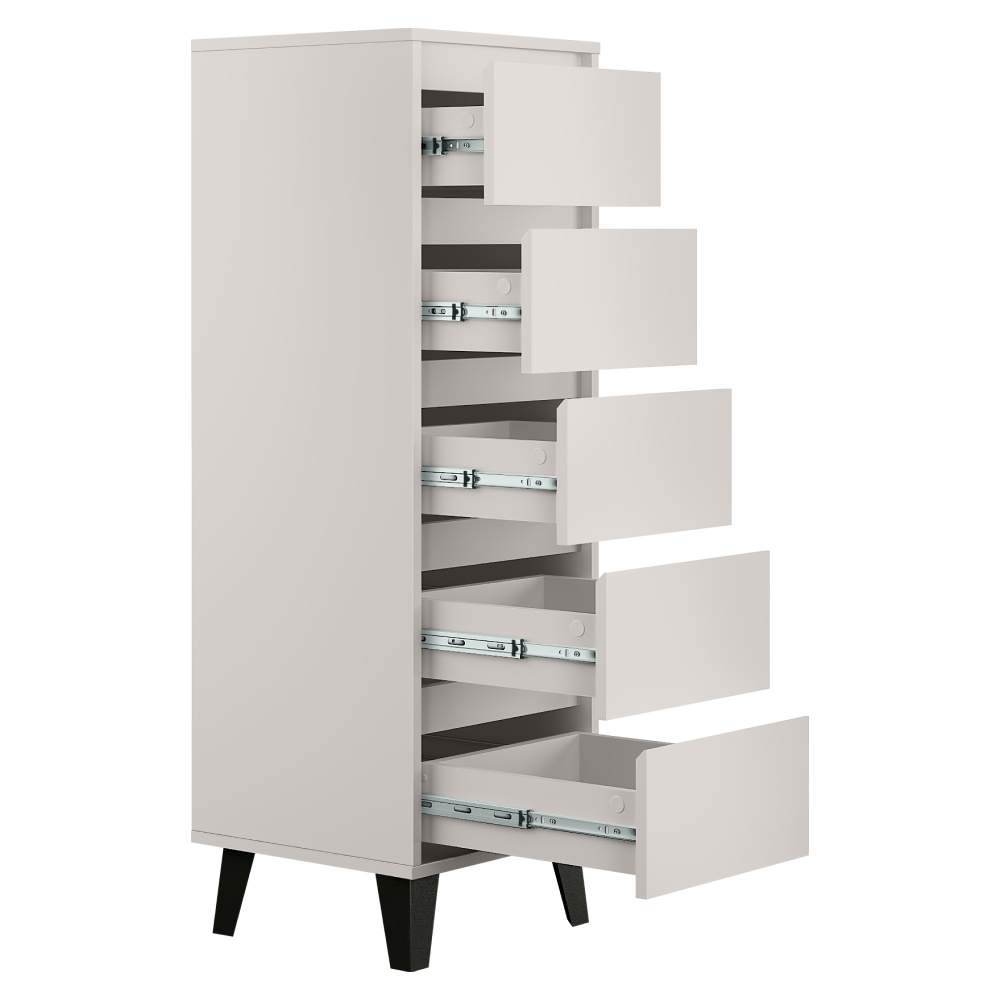 Materiál: laminovaná DTD Barva: kašmír Rozměry (ŠxHxV): 40x38,8x120,4 cm Výška spodního prostoru od podlahy: 12 cm Pět šuplíků Rozměr šuplíku (ŠxV): 36,2x18 cm Vnitřní rozměr šuplíku (ŠxHxV): 30,8x33,3x9 cm Na nožičkách Barva nožiček: černá Nosnost šuplíku: 5 kg Nosnost vrchní desky: 15 kg Moderní styl Bez úchytek Doporučujeme připevnit ke zdi Dodáváno v demontu