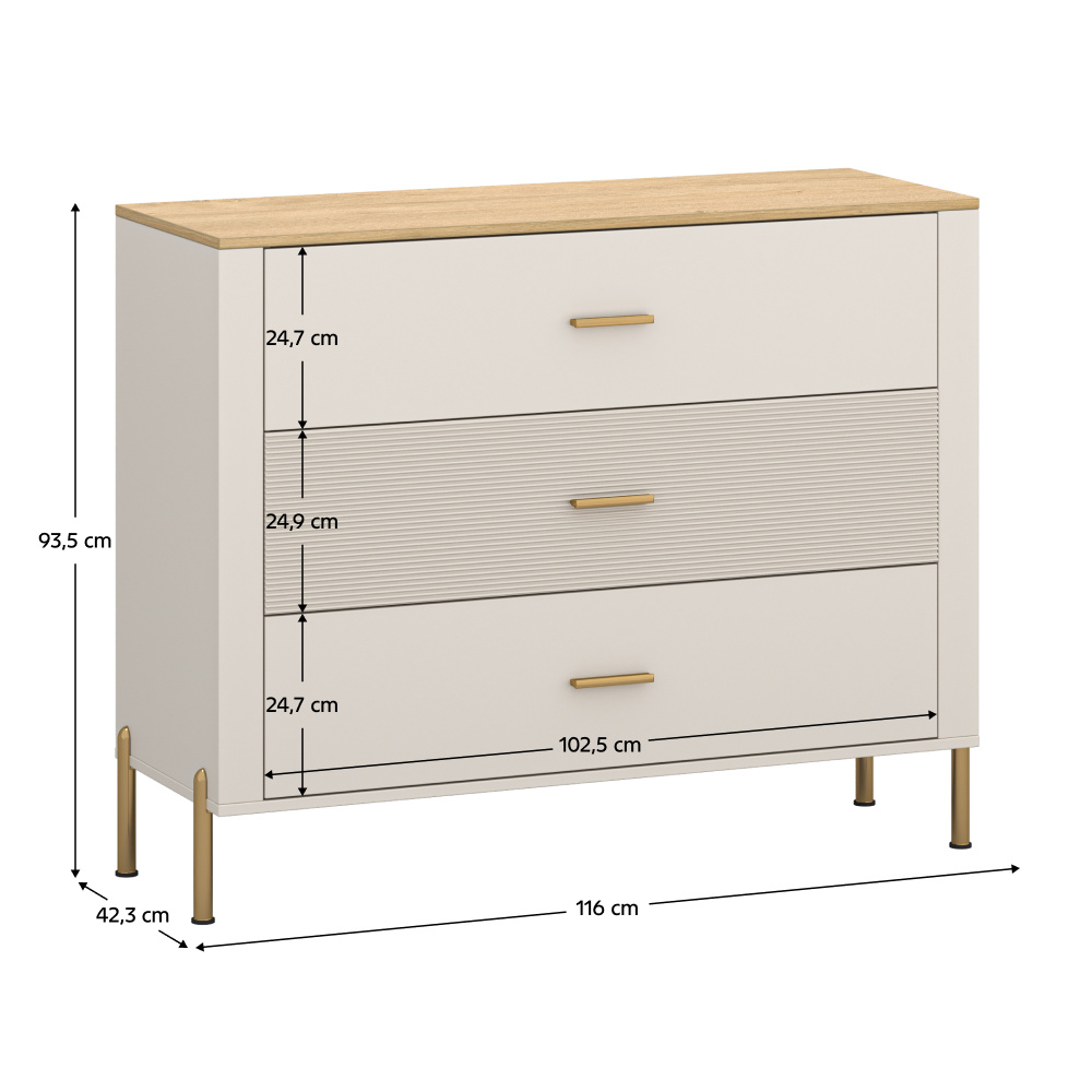 Materiál: DTD laminovaná/fóliovaná MDF/PVC Barva: kašmír/dub kamenný Rozměry (ŠxHxV): 116x42,3x93,5 cm Tloušťka materiálu: 1,6 cm Tři šuplíky Nosnost šuplíku: 3 kg S úchytkou Materiál úchytky: kov Barva úchytky: zlatá Na nožičkách Materiál nožiček: kov Barva nožiček: zlatá Výška nožiček: 15 cm Dekorativní frézovaná dvířka Moderní design Doporučujeme připevnit ke zdi Dodáváno v demontu