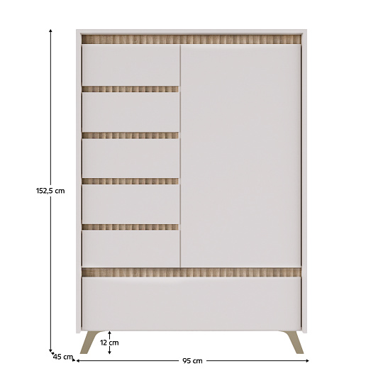 Materiál: laminovaná DTD/fóliovaná MDF/PVC fólie Barva: kašmír/dub sonoma Rozměry (ŠxHxV): 95x45x152,5 cm Tloušťka materiálu: 1,6-1,9 cm Jednodveřová Výklopná skříňka Pět zásuvek Police Na nožičkách Barva nožiček: přírodní Výška nožiček: 12 cm Plnovýsuvné kuličkové ložisko Panty Hrana : papír impregnovaný termosetovými polymery/PVC Tloušťka materiálu ABS: 0,5 mm Tloušťka dřevovláknité desky zadní strana/dno zásuvky: 0,3 cm Barva zadní strana/dno zásuvky: bílá Dekorativní frézování Bez úchytek Moderní design Dodáváno v demontu