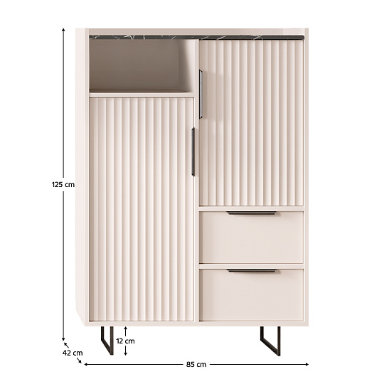 Materiál: laminovaná DTD/fóliovaná MDF Barva: kašmír/černý mramor Rozměry (ŠxHxV): 85x42x125 cm Tloušťka materiálu: 1,6 cm Dvoudveřová Dvě zásuvky Dvě skříňky Otevřený úložný prostor Policová Nosnost police: 4 kg Nosnost zásuvky: 2 kg Nosnost vrchní desky: 15 kg S úchytkami Materiál úchytek: kov Barva úchytek: černá Na nožičkách Materiál nožiček: kov Barva nožiček: černá Výška nožiček: 12 cm Dekorativní dvířka Hrany: papír potažený termoreaktivními polymery Tloušťka DTD zadní strana/dno zásuvky: 0,3 cm Barva zadní strana/dno zásuvky: bílá Plnovýsuvné kuličkové vedení Panty Moderní design Doporučujeme připevnit ke zdi Dodáváno v demontu