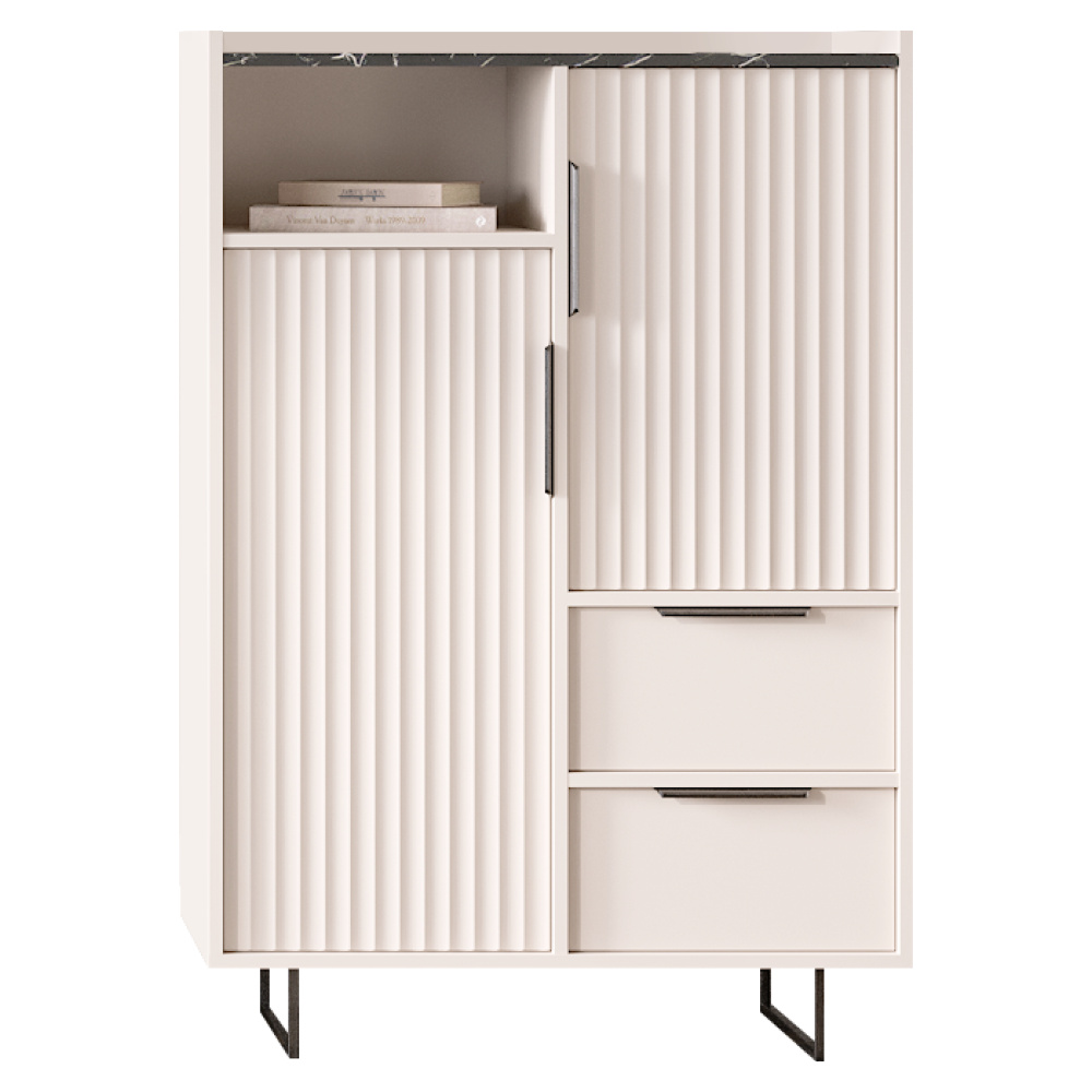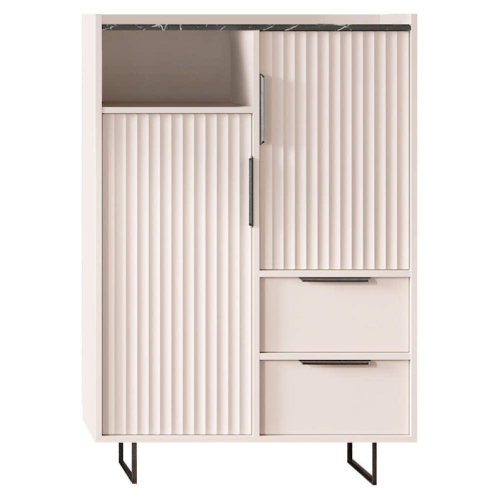 Materiál: laminovaná DTD/fóliovaná MDF Barva: kašmír/černý mramor Rozměry (ŠxHxV): 85x42x125 cm Tloušťka materiálu: 1,6 cm Dvoudveřová Dvě zásuvky Dvě skříňky Otevřený úložný prostor Policová Nosnost police: 4 kg Nosnost zásuvky: 2 kg Nosnost vrchní desky: 15 kg S úchytkami Materiál úchytek: kov Barva úchytek: černá Na nožičkách Materiál nožiček: kov Barva nožiček: černá Výška nožiček: 12 cm Dekorativní dvířka Hrany: papír potažený termoreaktivními polymery Tloušťka DTD zadní strana/dno zásuvky: 0,3 cm Barva zadní strana/dno zásuvky: bílá Plnovýsuvné kuličkové vedení Panty Moderní design Doporučujeme připevnit ke zdi Dodáváno v demontu