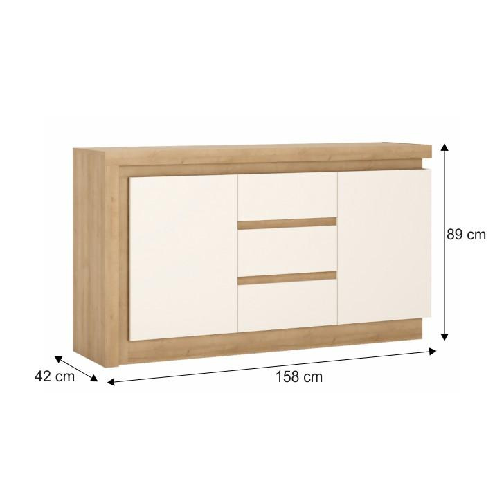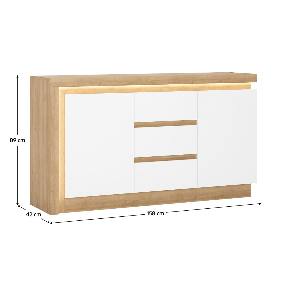 Komoda LYOK01 ze sektorové sestavy LEONARDO v provedení dub riviera / bílá s vysokým leskem. Rozměry (ŠxHxV): 158x89x42 cm Tloušťka materálu: 16 mm Systém tichého dorazu dvířek Systém tichého dorazu šuplíků LED osvětlení po obvodu je v ceně Dodávané v demontu