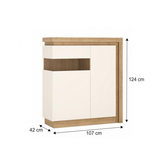 Komoda LYOV04L ze sektorové sestavy LEONARDO v provedení dub riviera / bílá s vysokým leskem. Rozměry (ŠxHxV): 107x42x124 cm Tloušťka materálu: 16 mm Systém tichého dorazu dvířek LED osvětlení po obvodu je v ceně Dodávané v demontu