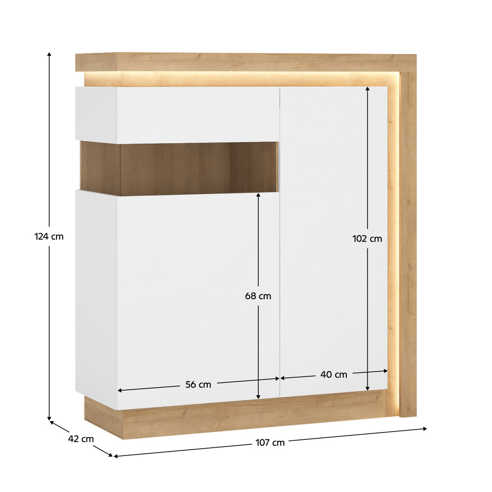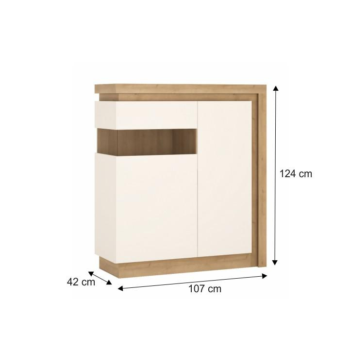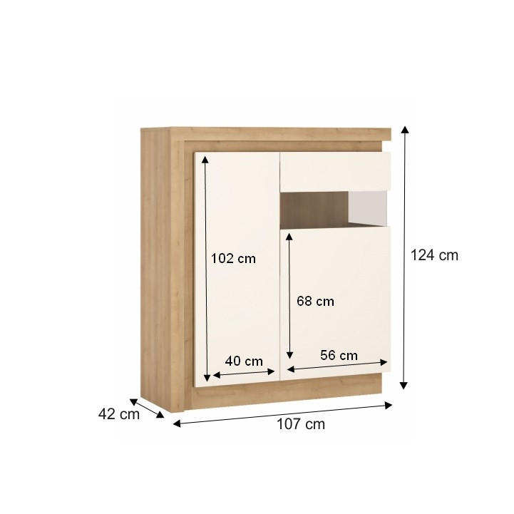 Komoda LYOV04L ze sektorové sestavy LEONARDO v provedení dub riviera / bílá s vysokým leskem. Rozměry (ŠxHxV): 107x42x124 cm Tloušťka materálu: 16 mm Systém tichého dorazu dvířek LED osvětlení po obvodu je v ceně Dodávané v demontu