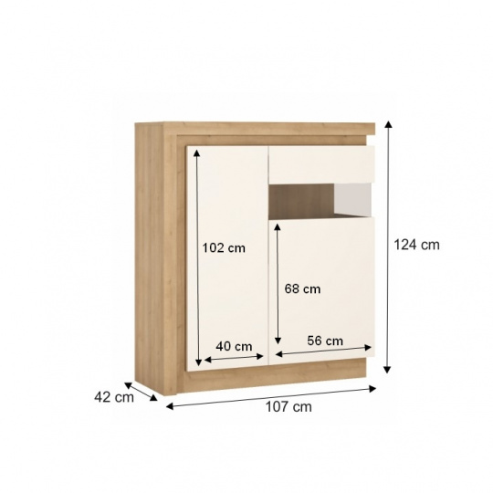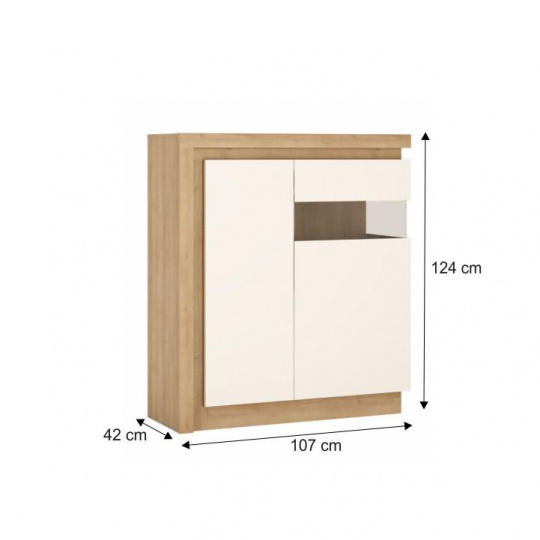 Komoda LYOV04P ze sektorové sestavy LEONARDO v provedení dub riviera / bílá s vysokým leskem. Rozměry (ŠxHxV): 107x42x124 cm Tloušťka materálu: 16 mm Systém tichého dorazu dvířek LED osvětlení po obvodu je v ceně Dodávané v demontu