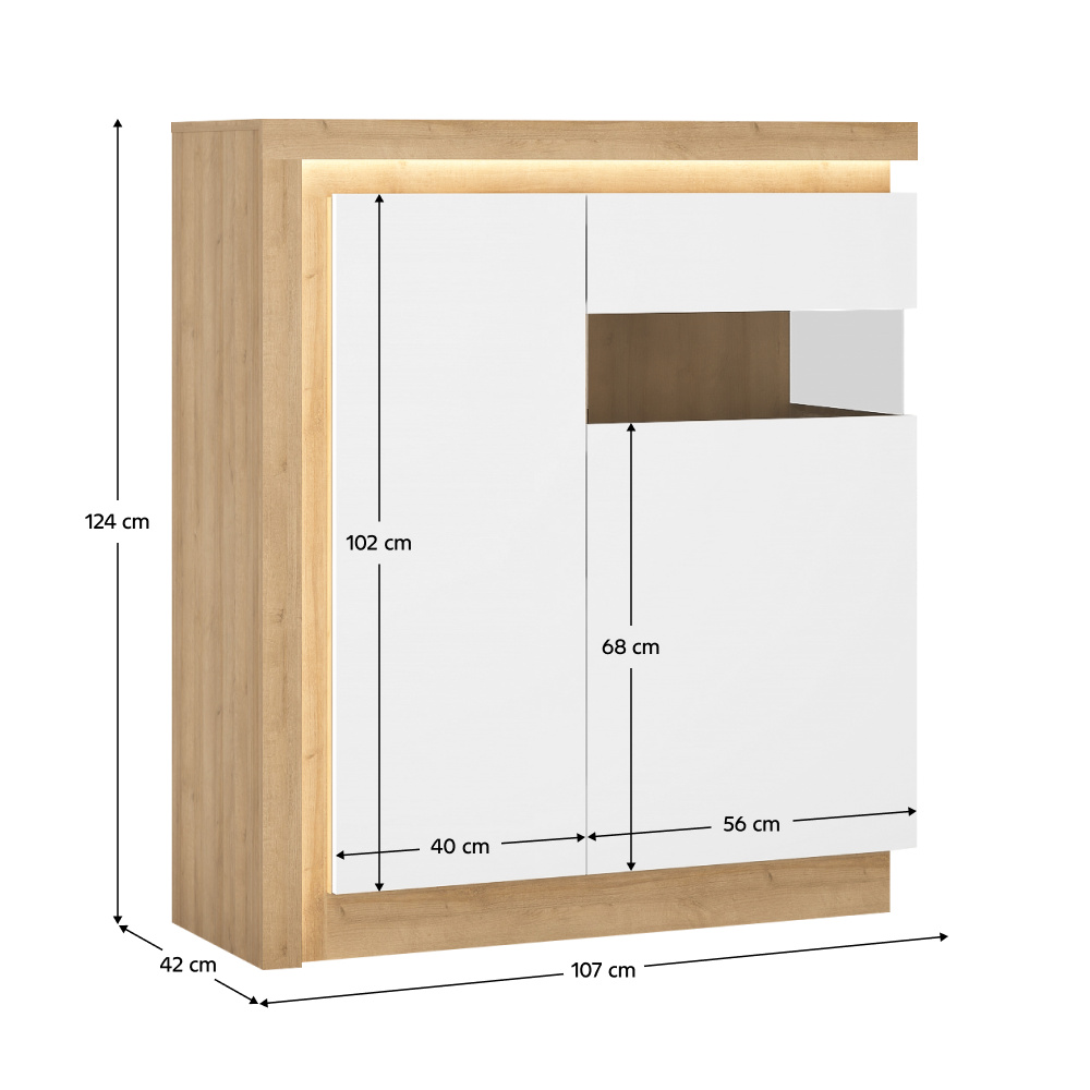 Komoda LYOV04P ze sektorové sestavy LEONARDO v provedení dub riviera / bílá s vysokým leskem. Rozměry (ŠxHxV): 107x42x124 cm Tloušťka materálu: 16 mm Systém tichého dorazu dvířek LED osvětlení po obvodu je v ceně Dodávané v demontu