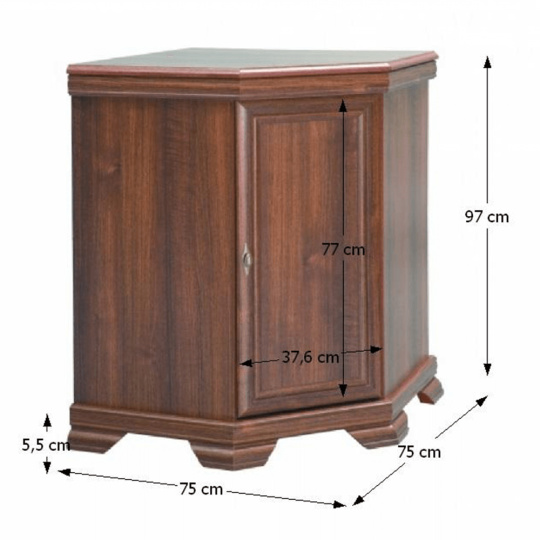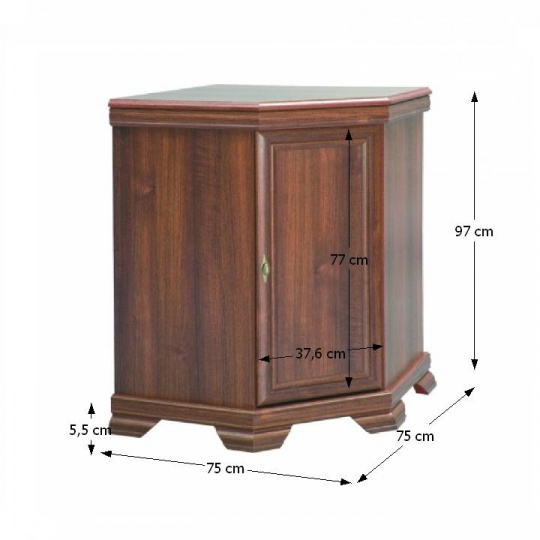Rohová komoda KKN1 KORA. Materiál laminovaná DTD, MDF, kov Barevné provedení: samoa king. Rozměry (ŠxHxV): 75x75x97 cm Výška spodního prostoru od podlahy: 10,5 cm Dodávané v demontu.