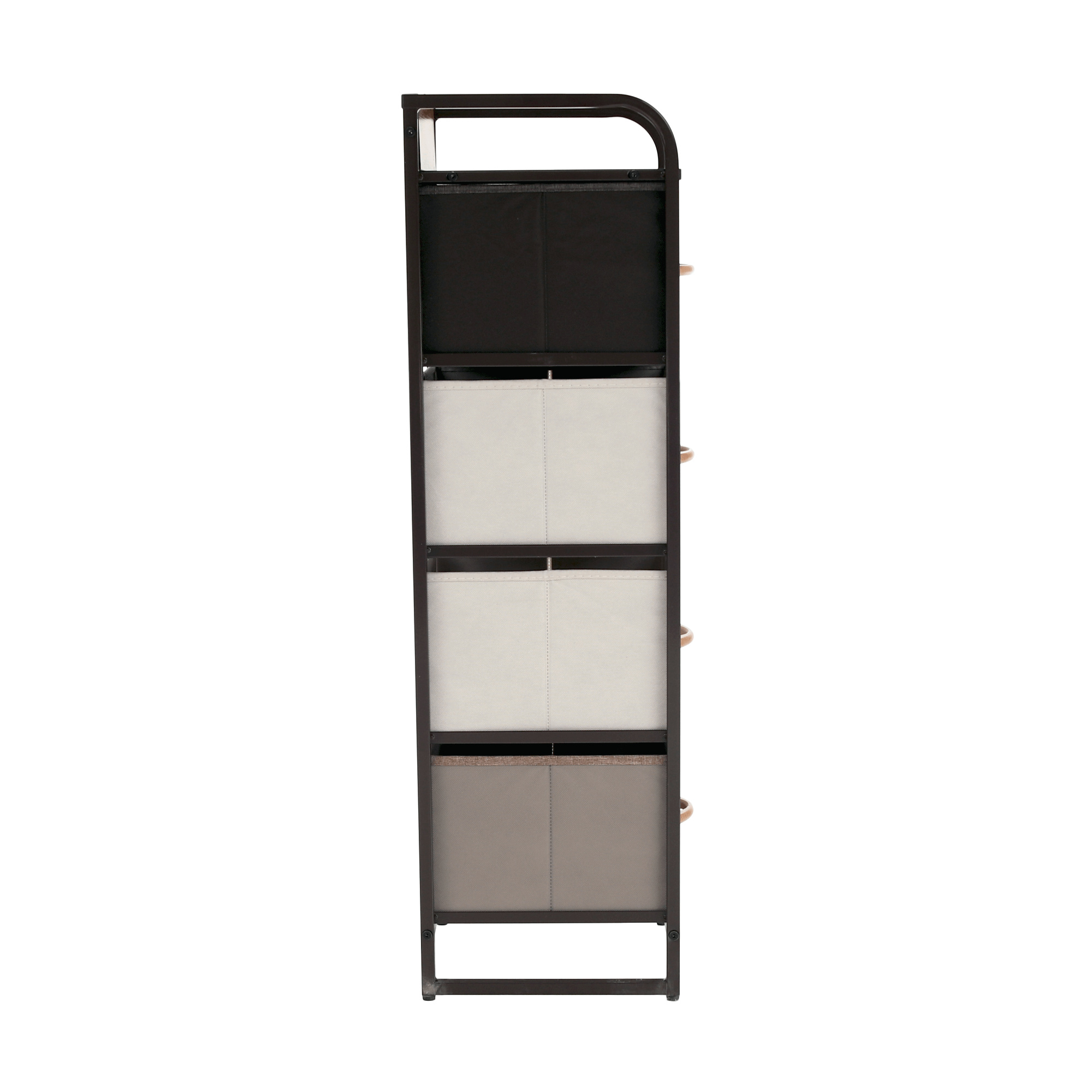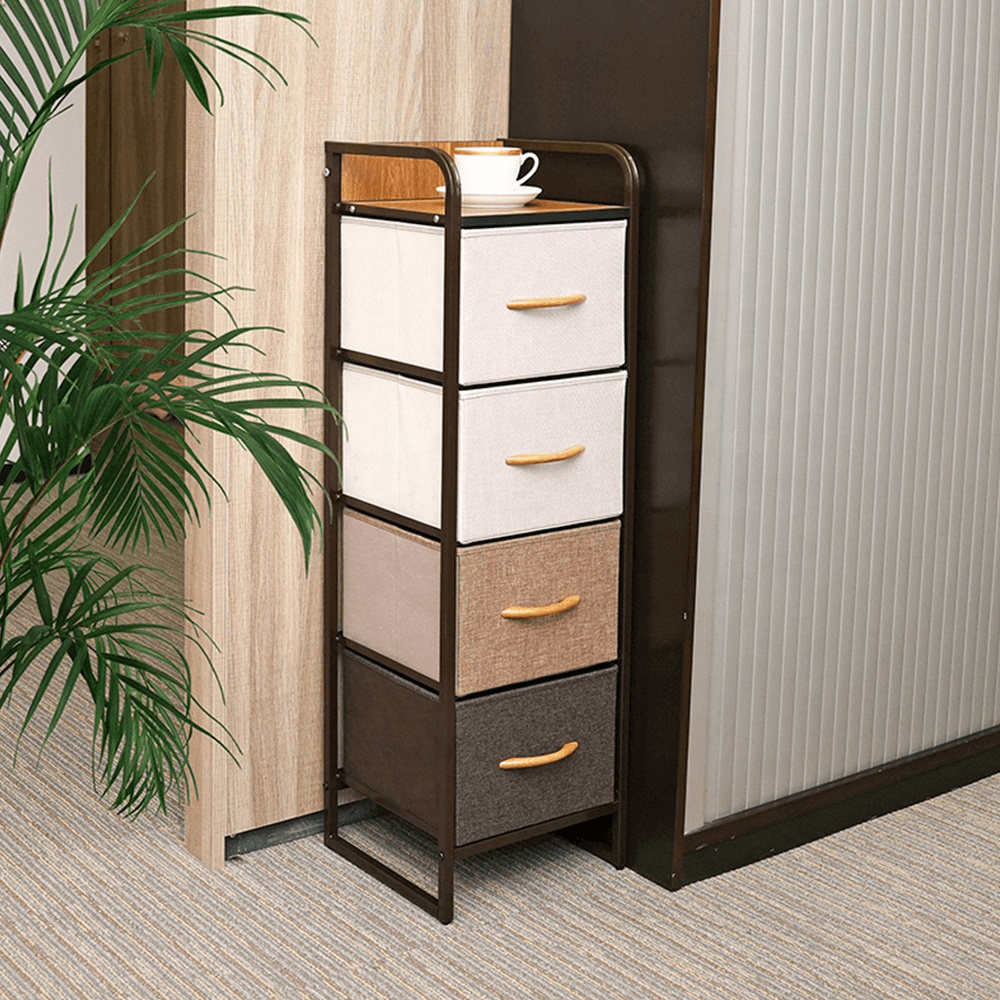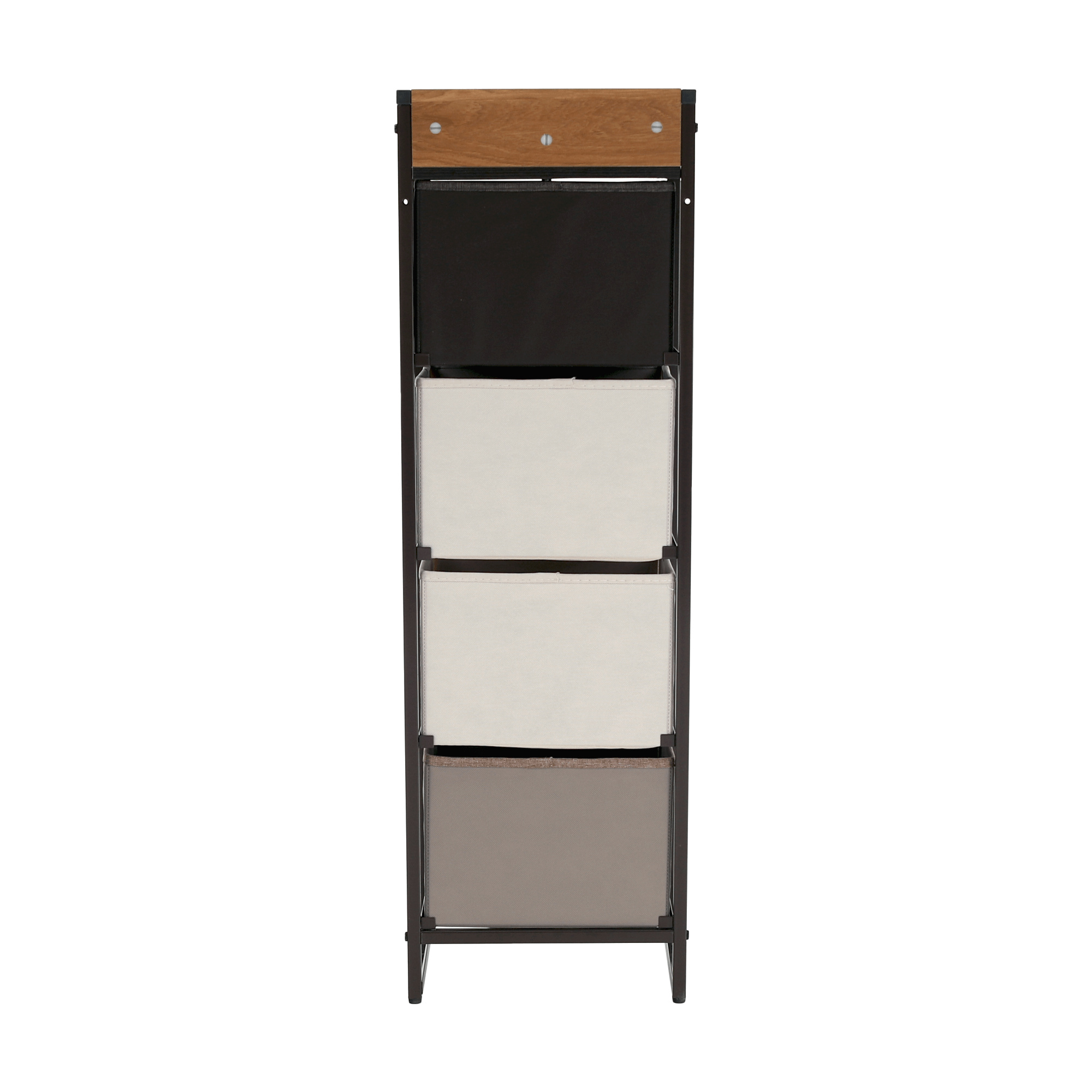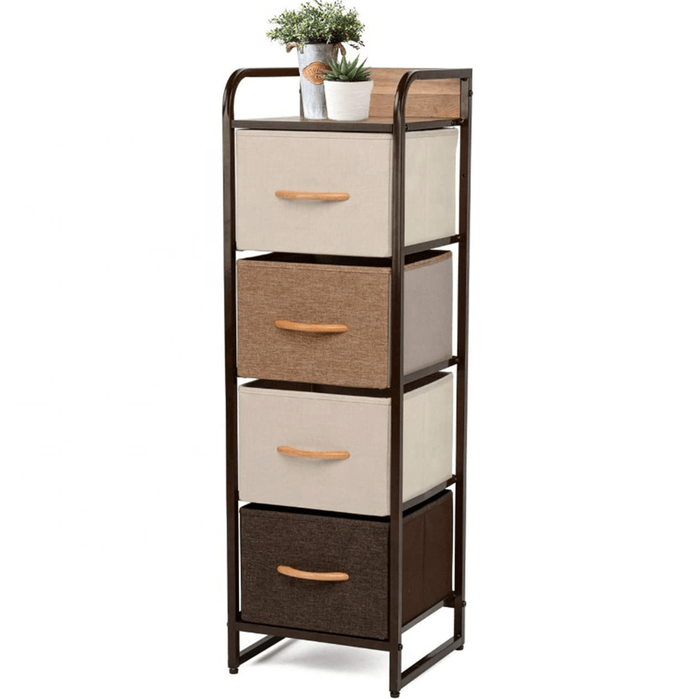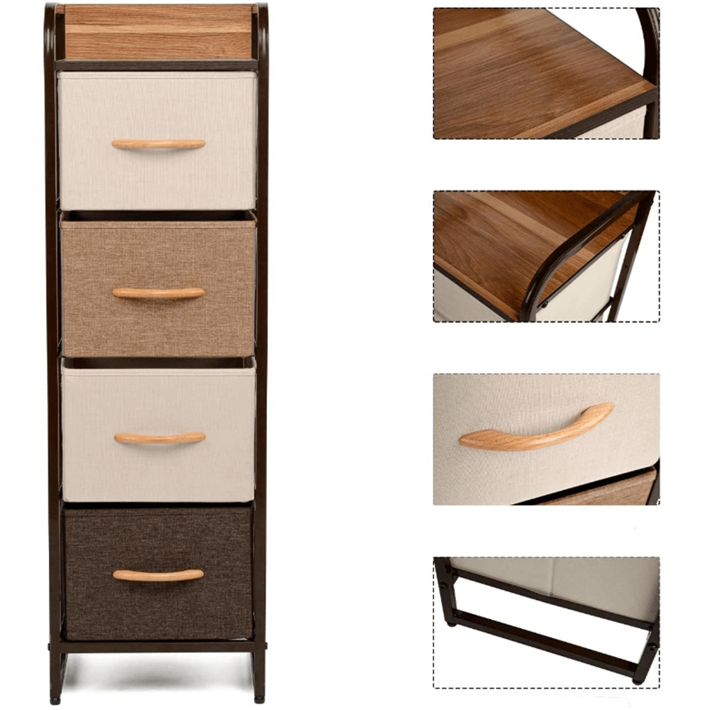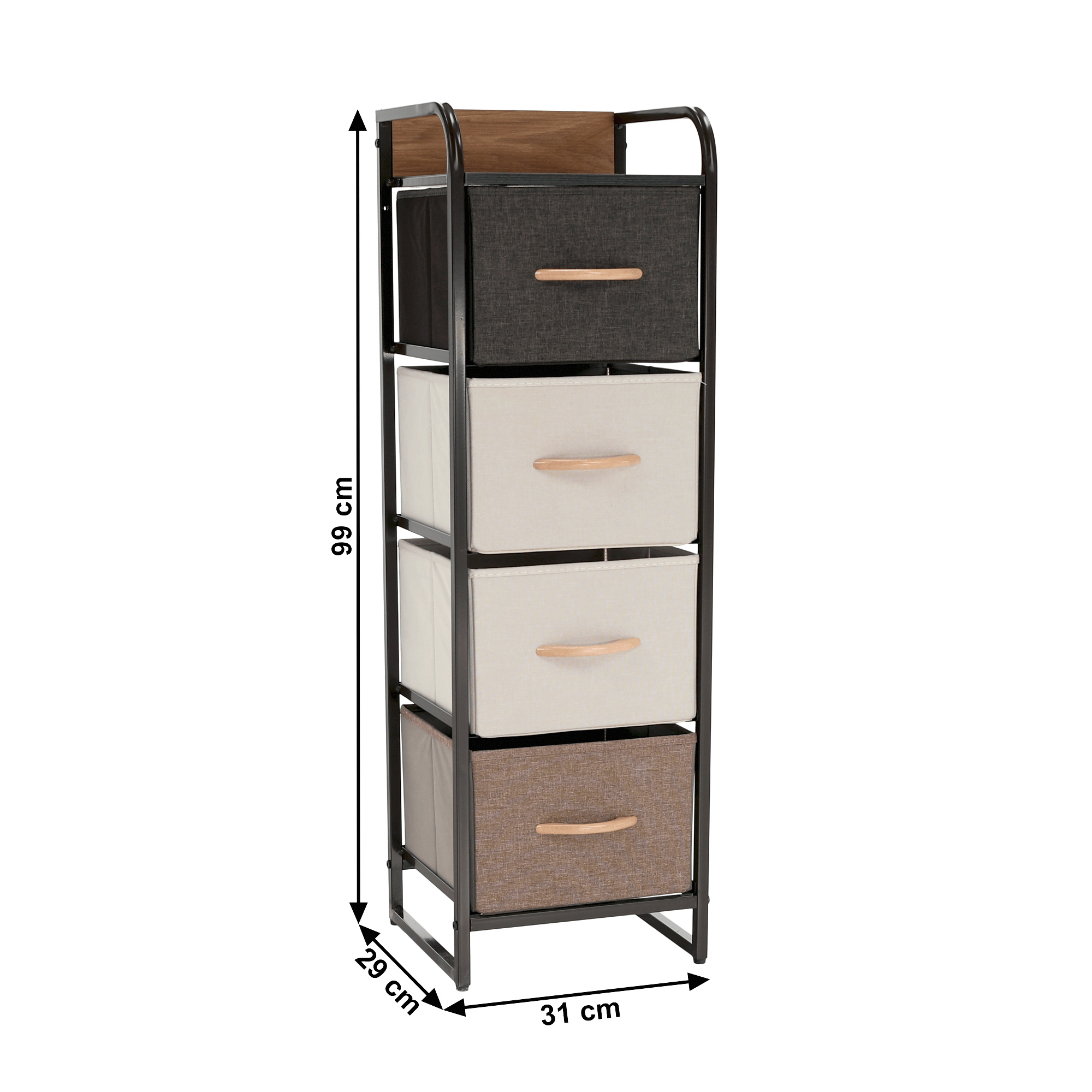 Materiál: MDF / kov / látka / plast Barva: béžová / světlehnědá / tmavohnědá Rozměry (ŠxHxV): 31x29x99 cm Tloušťka vrchního plátu: 1,2 cm čtyři šuplíky kovová konstrukce látkové šuplíky S dřevěnými úchytkami Dodávané v demontu