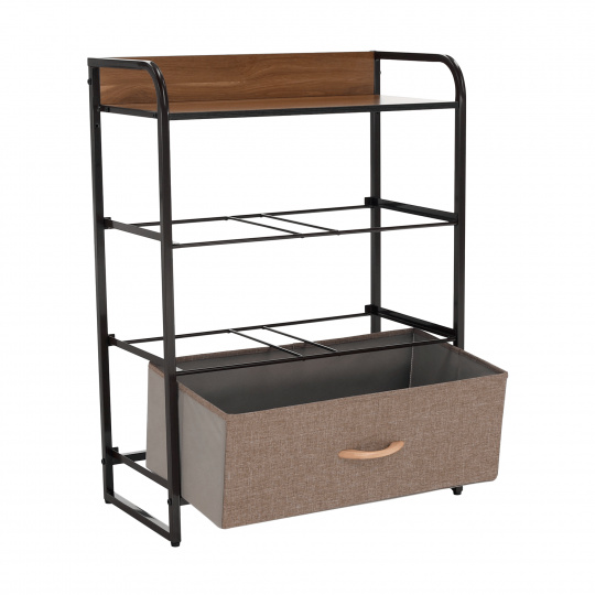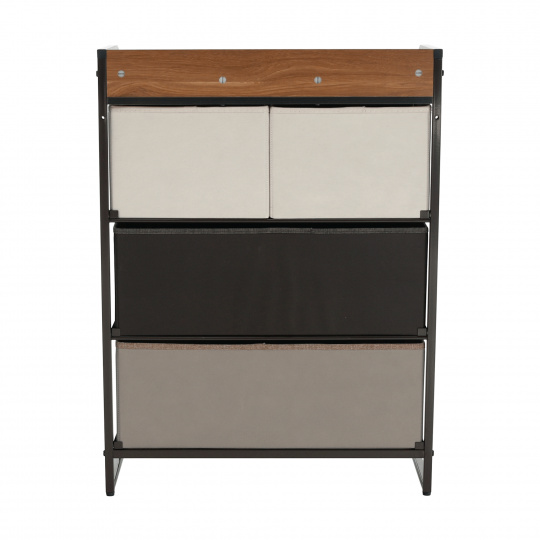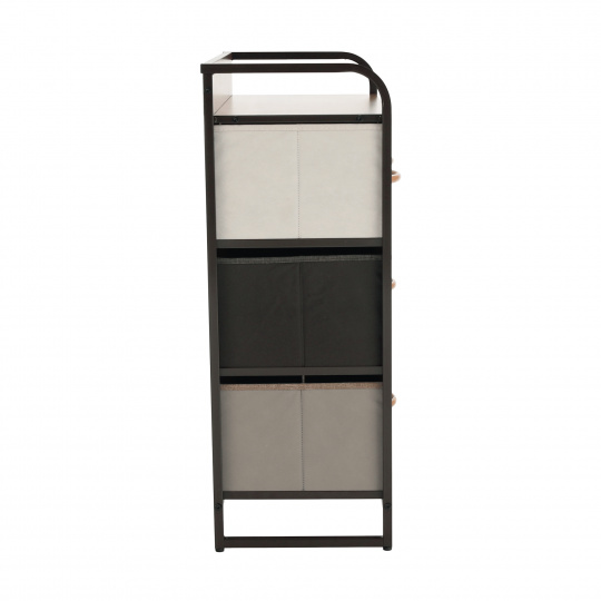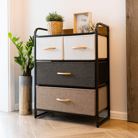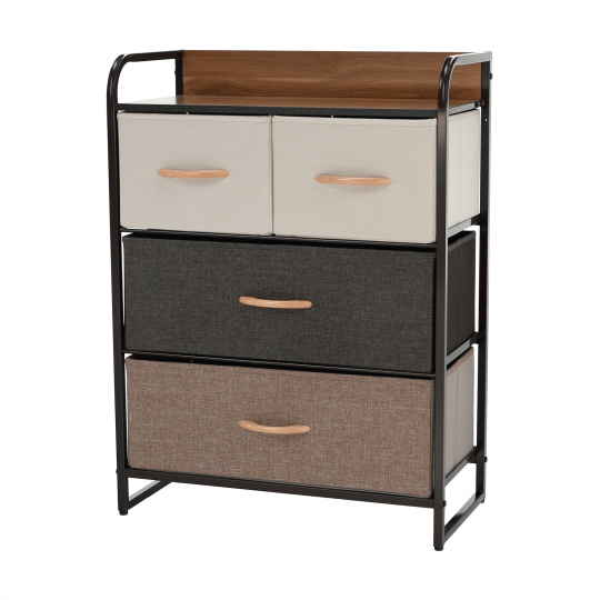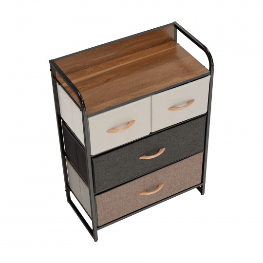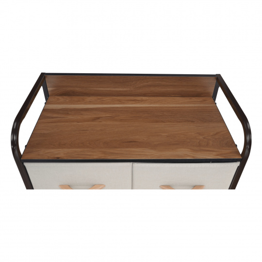 Materiál: MDF / kov / látka / plast Barva: béžová / světlehnědá / tmavohnědá Rozměry (ŠxHxV): 58x29x78,5 cm Tloušťka vrchního plátu: 1,2 cm čtyři šuplíky kovová konstrukce látkové šuplíky S dřevěnými úchytkami Dodávané v demontu