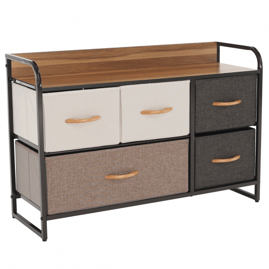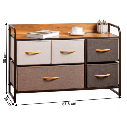Materiál: MDF / kov / látka / plast Barva: béžová / světlehnědá / tmavohnědá Rozměry (ŠxHxV): 87,5x29x58 cm Tloušťka vrchního plátu: 1,2 cm Pět šuplíků kovová konstrukce látkové šuplíky S dřevěnými úchytkami Dodávané v demontu
