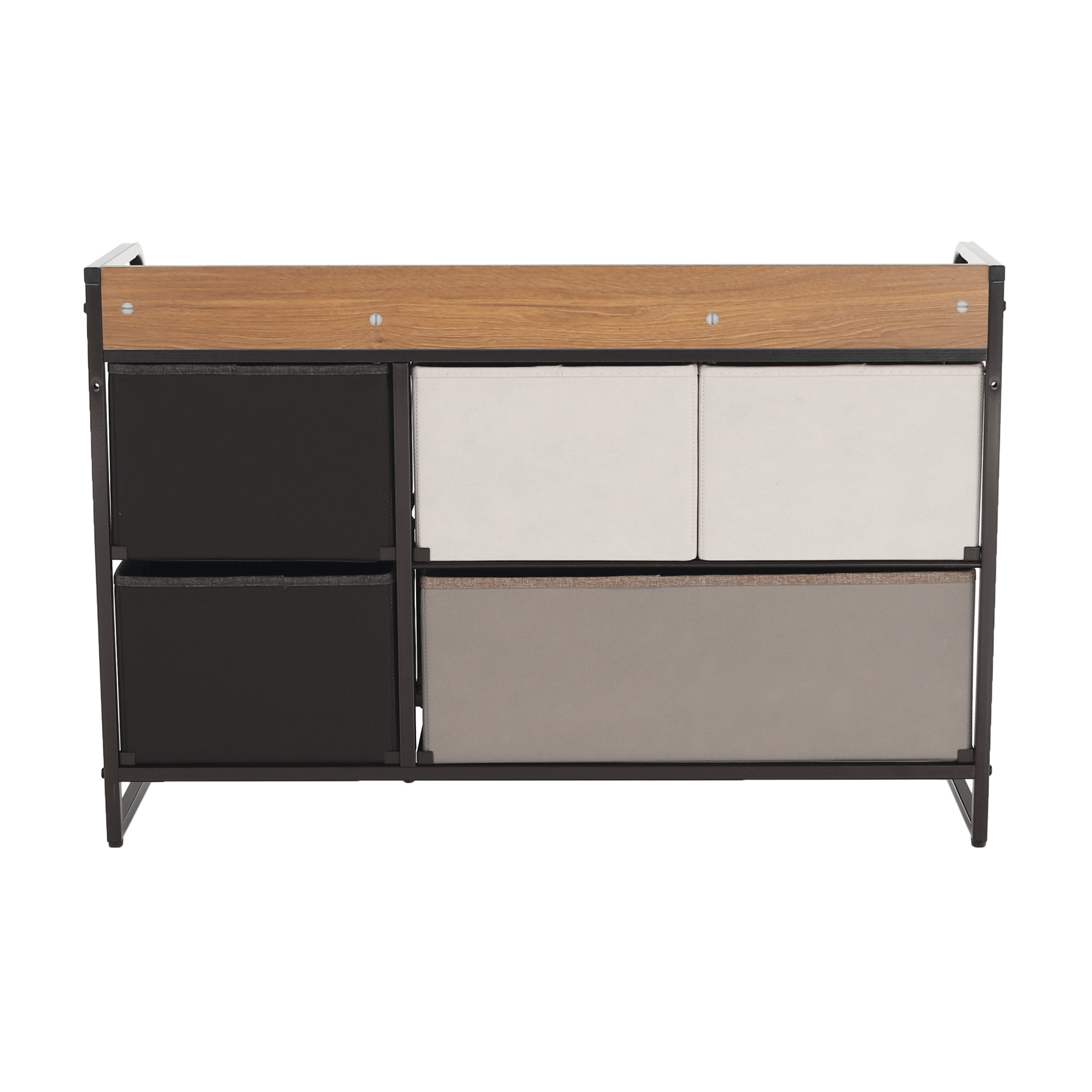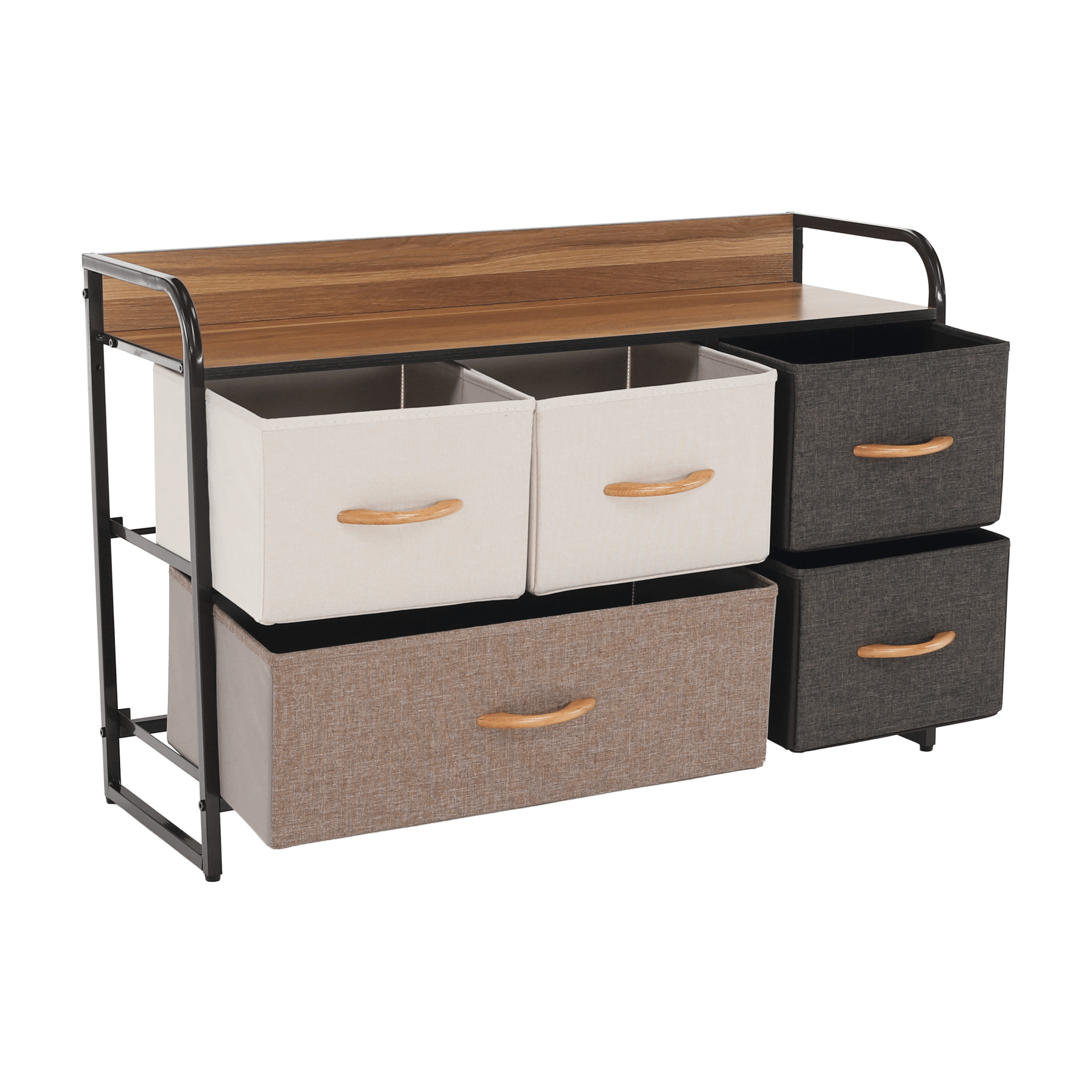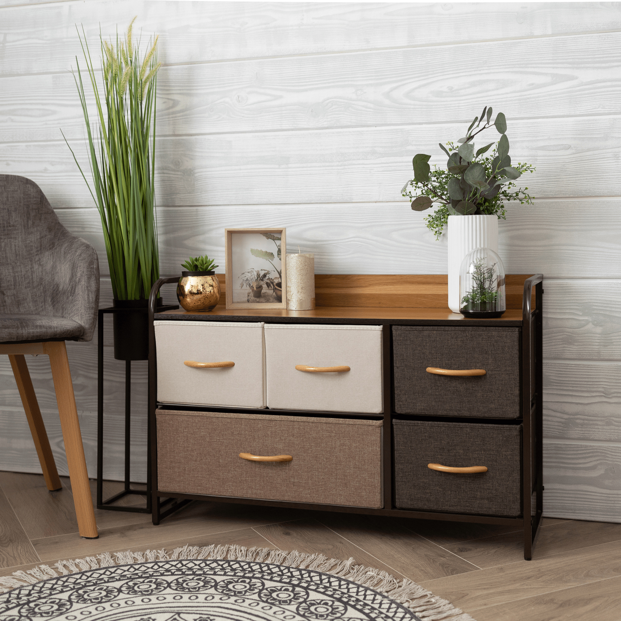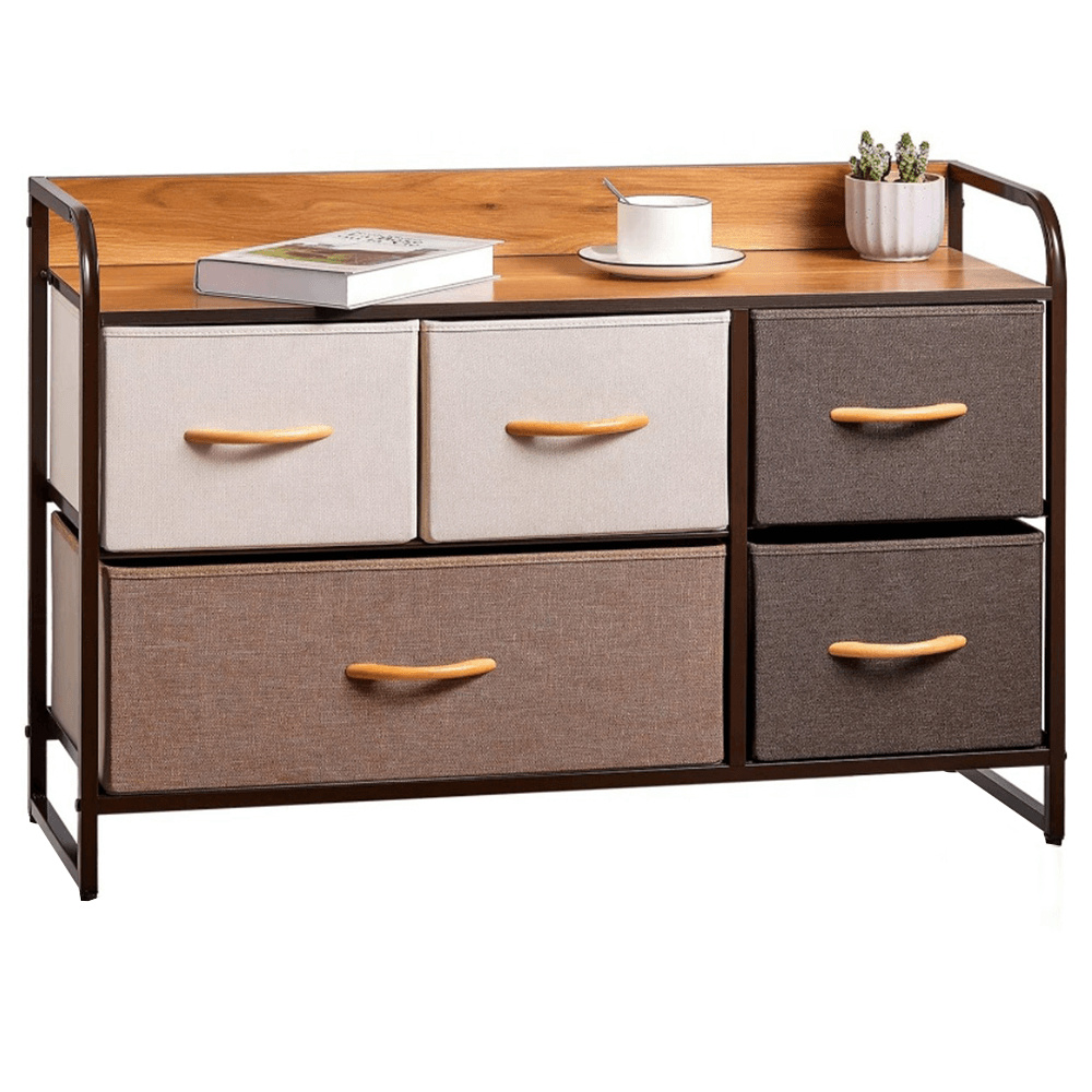 Materiál: MDF / kov / látka / plast Barva: béžová / světlehnědá / tmavohnědá Rozměry (ŠxHxV): 87,5x29x58 cm Tloušťka vrchního plátu: 1,2 cm Pět šuplíků kovová konstrukce látkové šuplíky S dřevěnými úchytkami Dodávané v demontu