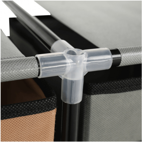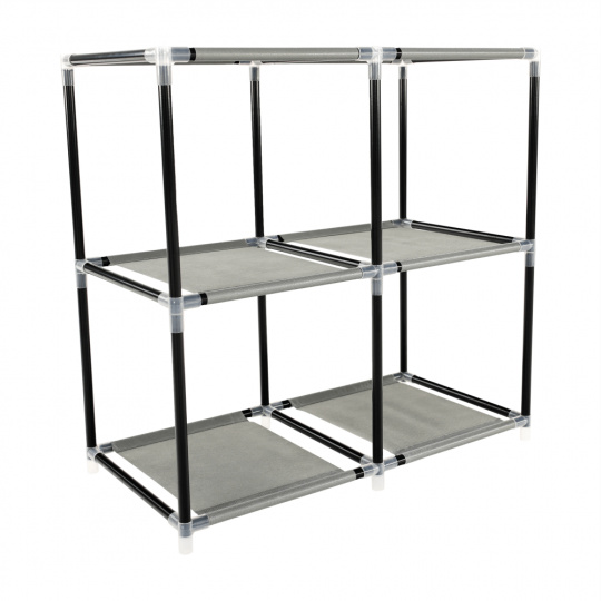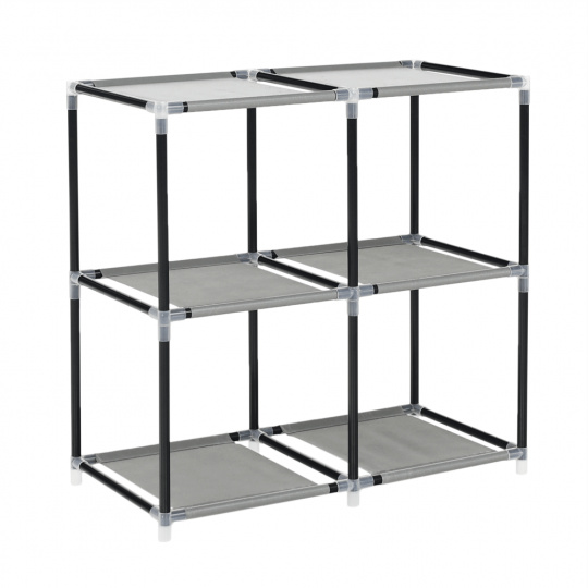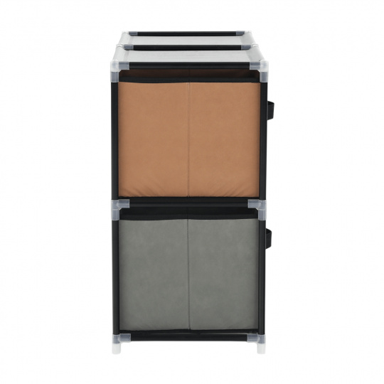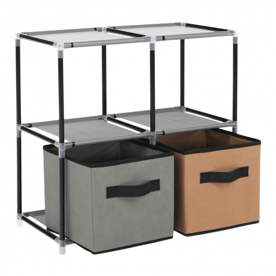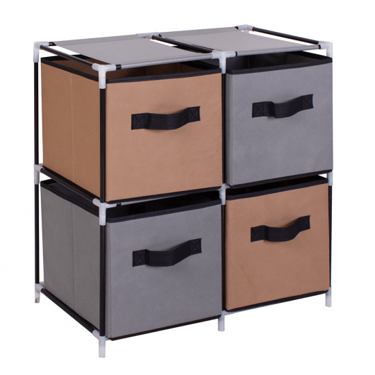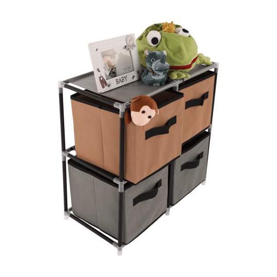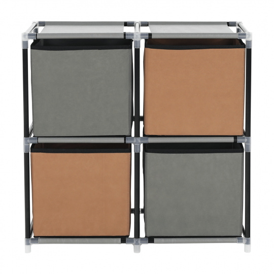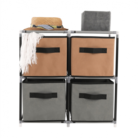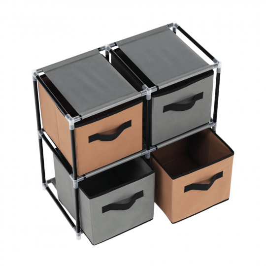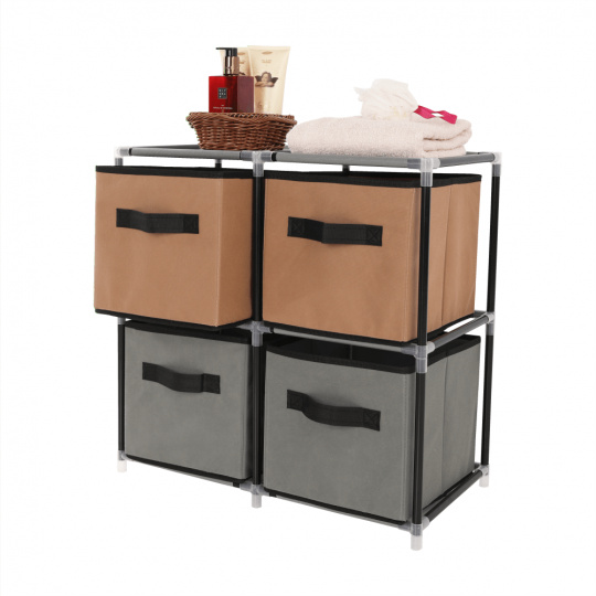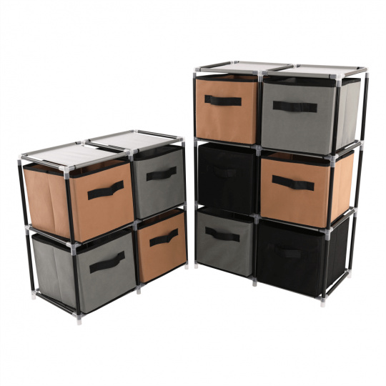 Materiál konstrukce: kov Barva: černá Materiál šuplíky: látka Barva: hnědá / šedá Materiál spojovací díly: plast Rozměry (ŠxHxV): 58x30x57 cm čtyři šuplíky Praktická kovová konstrukce látkové šuplíky S úchytkami Plastové spojovací díly jednoduchá montáž Různé varianty poskládání Dodávané v demontu