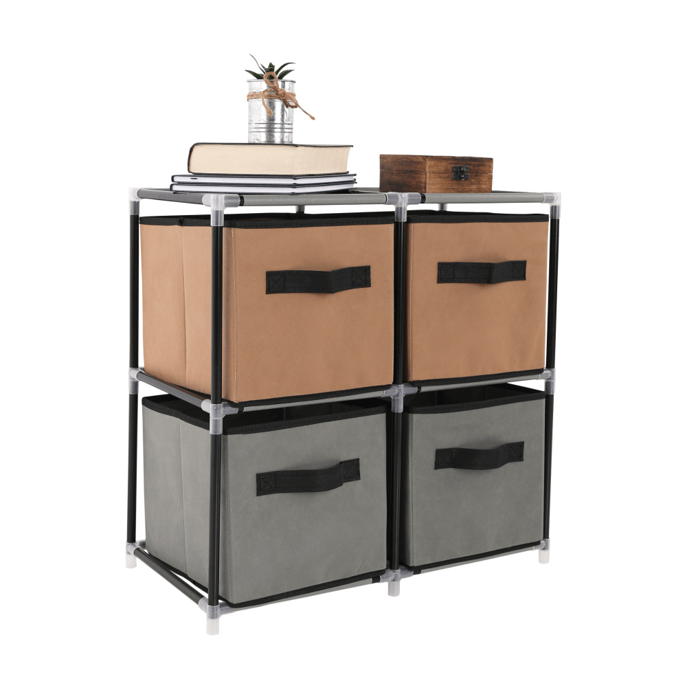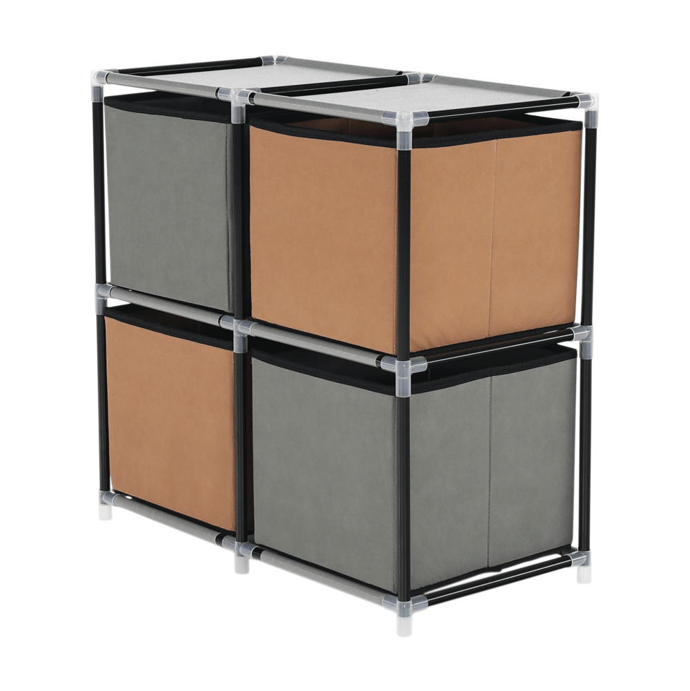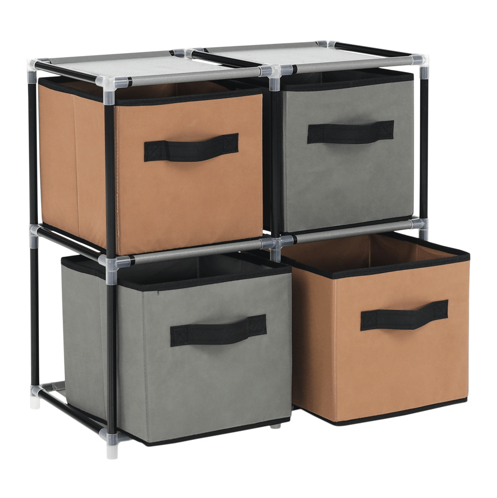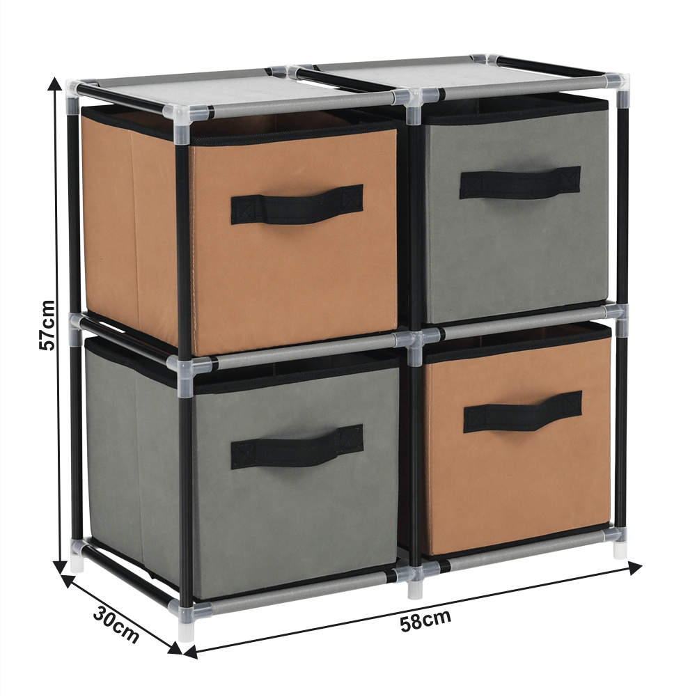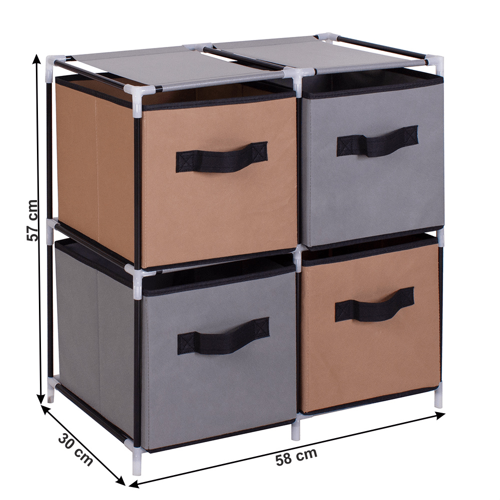 Materiál konstrukce: kov Barva: černá Materiál šuplíky: látka Barva: hnědá / šedá Materiál spojovací díly: plast Rozměry (ŠxHxV): 58x30x57 cm čtyři šuplíky Praktická kovová konstrukce látkové šuplíky S úchytkami Plastové spojovací díly jednoduchá montáž Různé varianty poskládání Dodávané v demontu