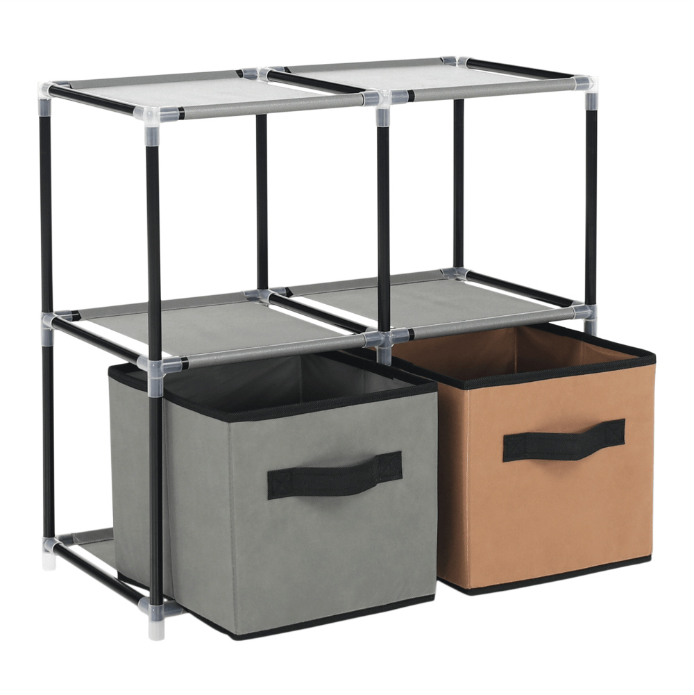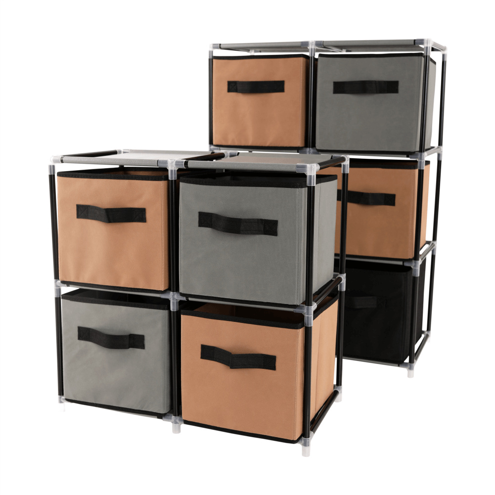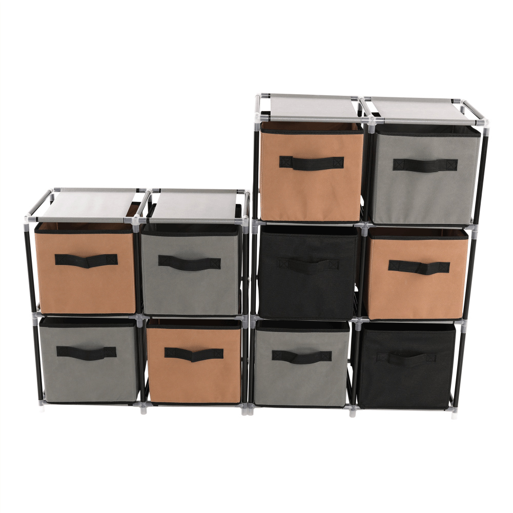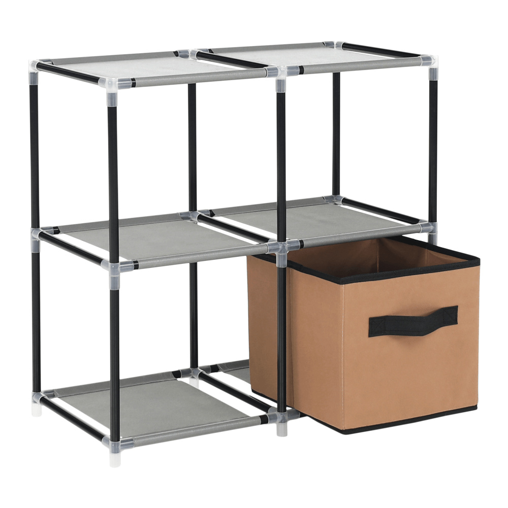 Materiál konstrukce: kov Barva: černá Materiál šuplíky: látka Barva: hnědá / šedá Materiál spojovací díly: plast Rozměry (ŠxHxV): 58x30x57 cm čtyři šuplíky Praktická kovová konstrukce látkové šuplíky S úchytkami Plastové spojovací díly jednoduchá montáž Různé varianty poskládání Dodávané v demontu