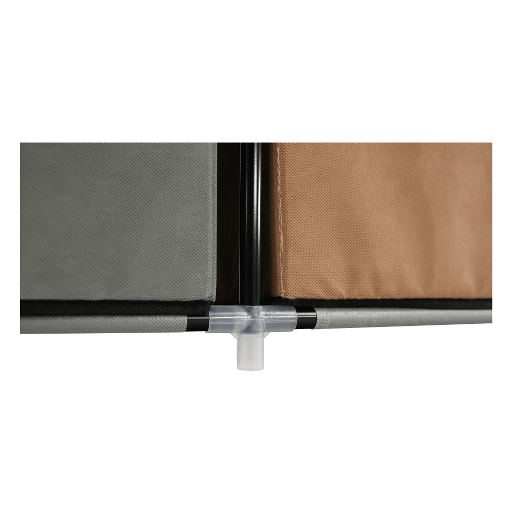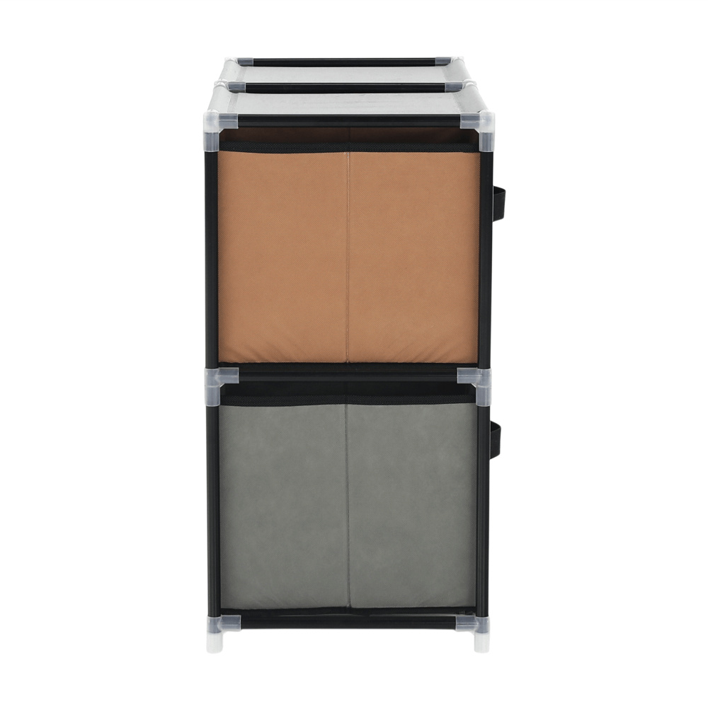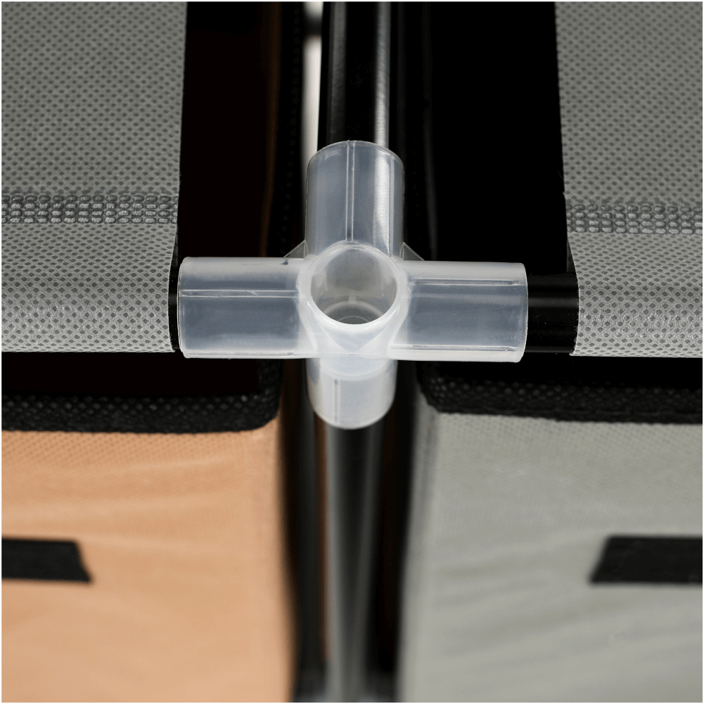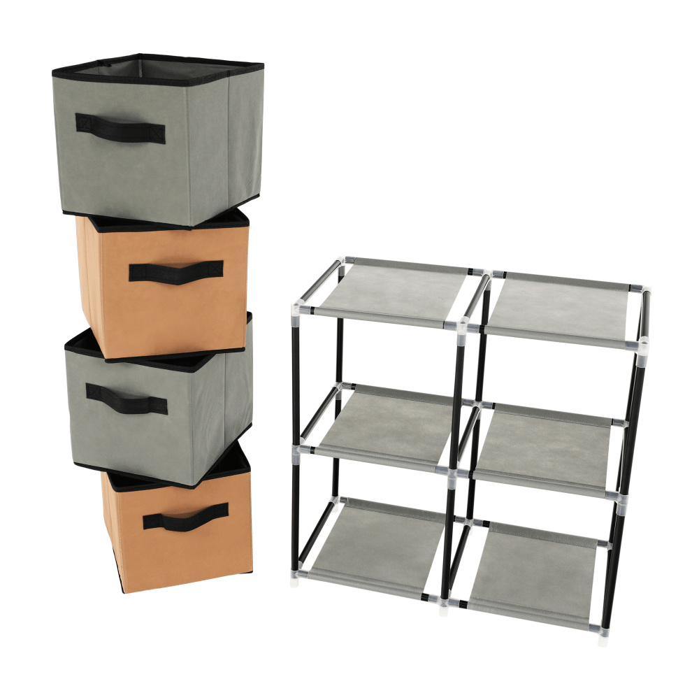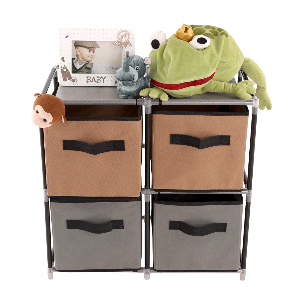 Materiál konstrukce: kov Barva: černá Materiál šuplíky: látka Barva: hnědá / šedá Materiál spojovací díly: plast Rozměry (ŠxHxV): 58x30x57 cm čtyři šuplíky Praktická kovová konstrukce látkové šuplíky S úchytkami Plastové spojovací díly jednoduchá montáž Různé varianty poskládání Dodávané v demontu