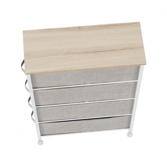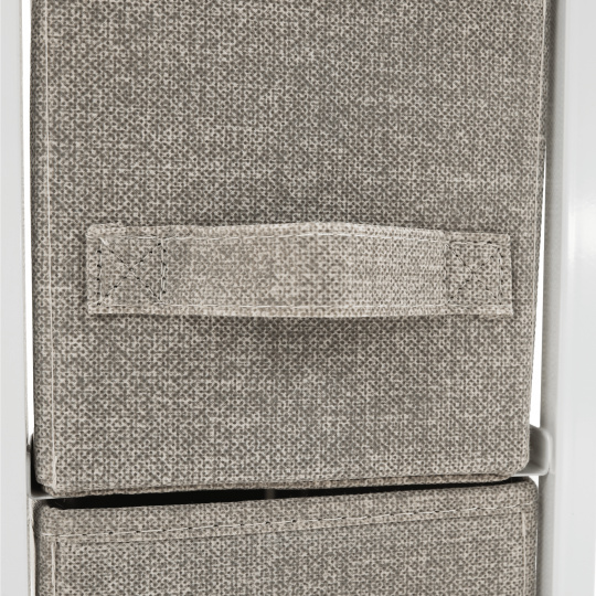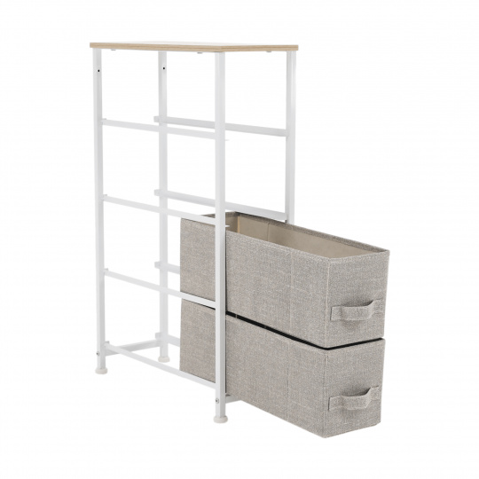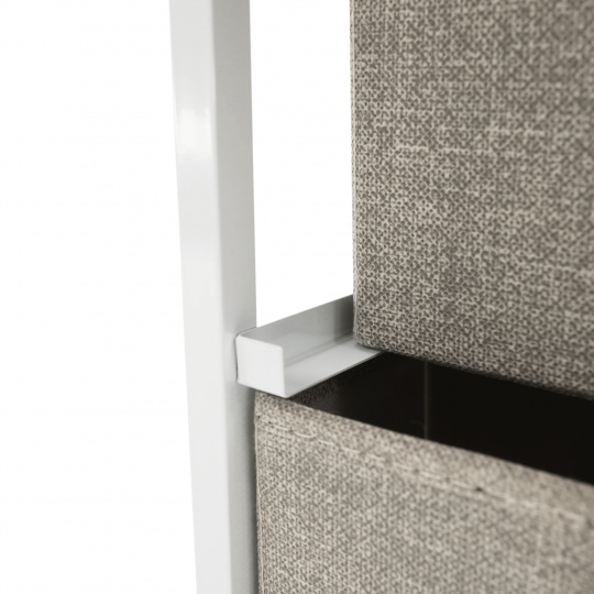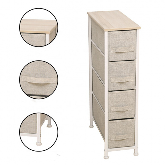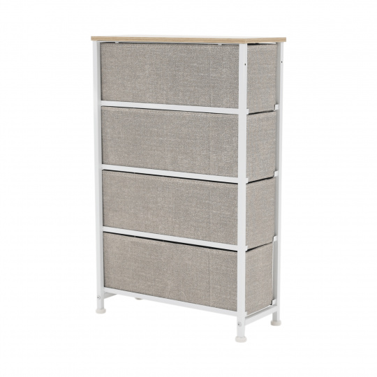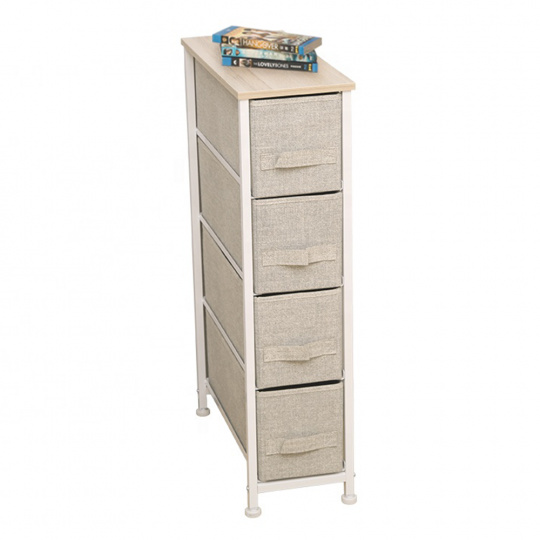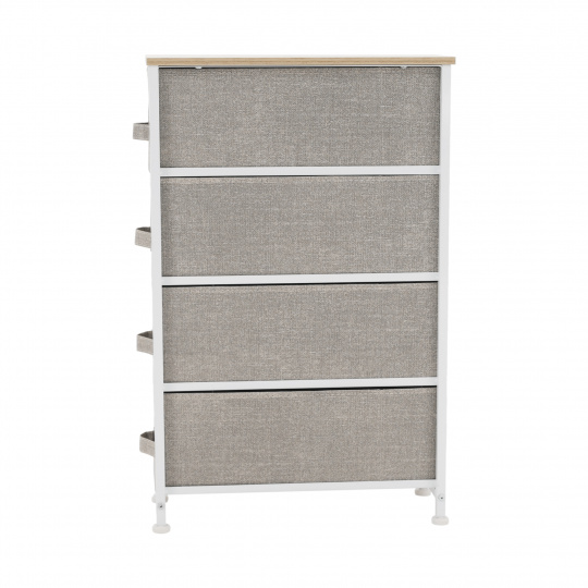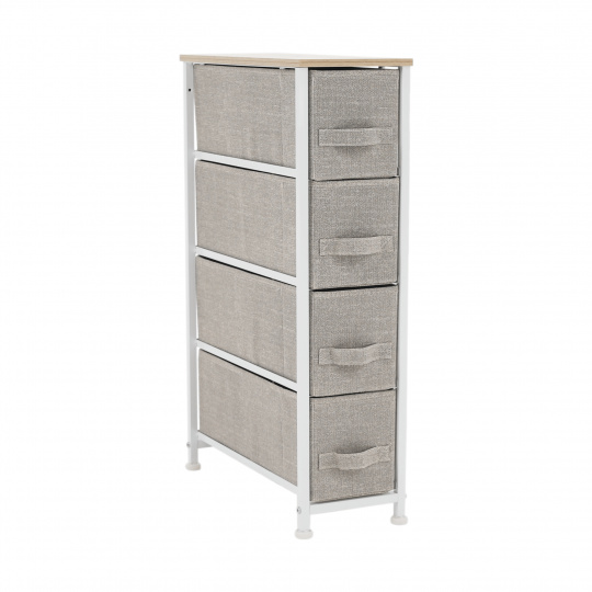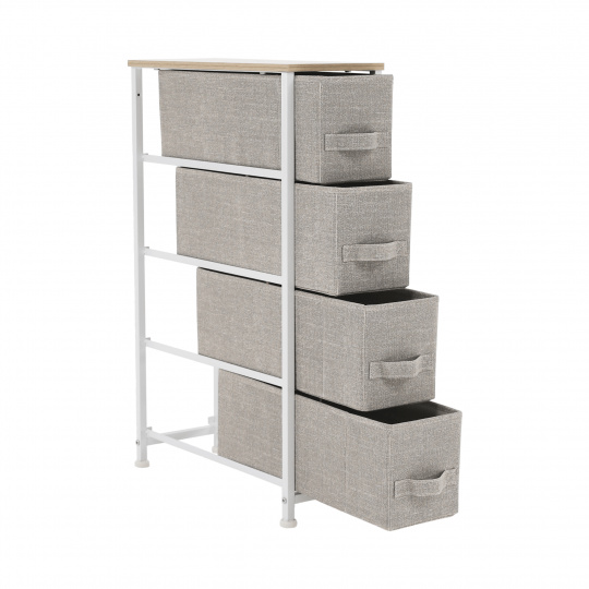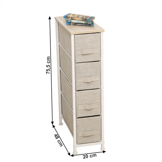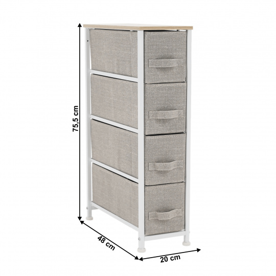 Materiál: MDF / kov / látka Barva: světlešedá / bílá / béžová Rozměry (ŠxHxV): 20x48x75,5 cm Rozměr šuplíku (ŠxHxV): 16x46x17 cm čtyři šuplíky Kobvová konstrukce látkové šuplíky S úchytkami Dodávané v demontu