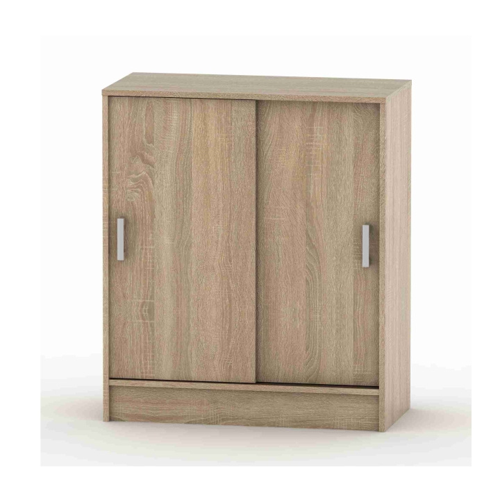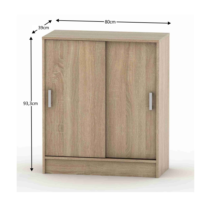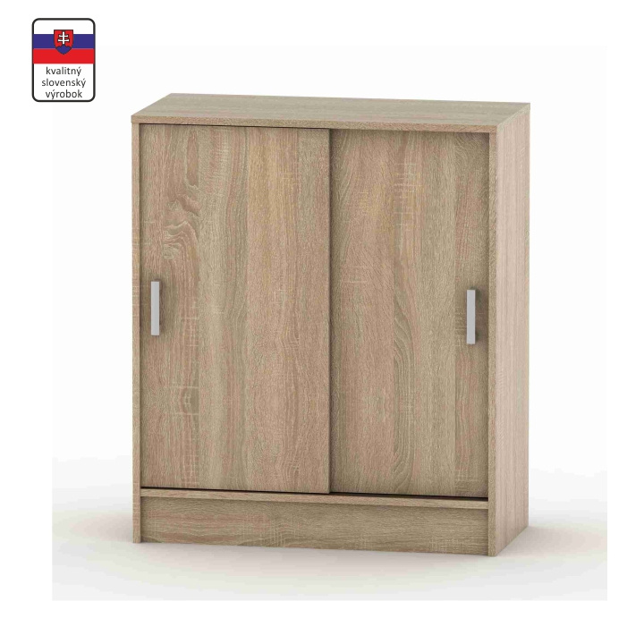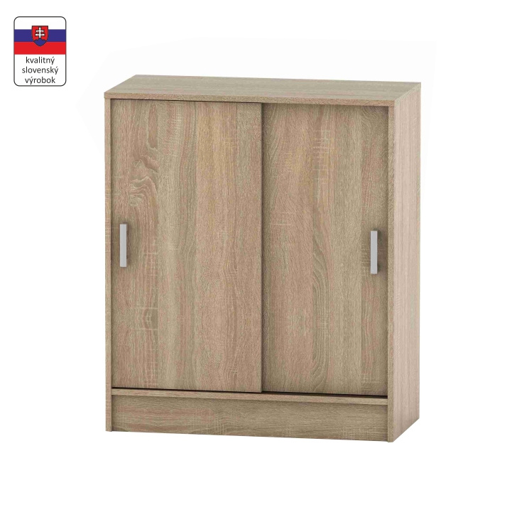Komoda s posuvnými dveřmi a se dvěma policemi BETTY 4 Materiál: DTD laminovaná Barva: dub sonoma Rozměry (ŠxHxV): 80x39x93,3 cm Dodávané v demontu. Tloušťka lamina: 1,6 cm Slovenský výrobek.