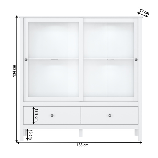 Materiál: DTD laminovaná/ABS hrany/MDF/sklo Barva: bílá Rozměry (ŠxHxV): 133x37x134 cm Výška nožiček: 16 cm Tloušťka materiálu: 1,6 cm Kombinovaná vitrína Dvoudveřová Obsahuje dvířka se sklem a dva šuplíky Výška šuplíku: 18,9 cm Ve skříňce jsou police Bez LED osvětlení Možnost dokoupení LED osvětlení Dodávána v demontu