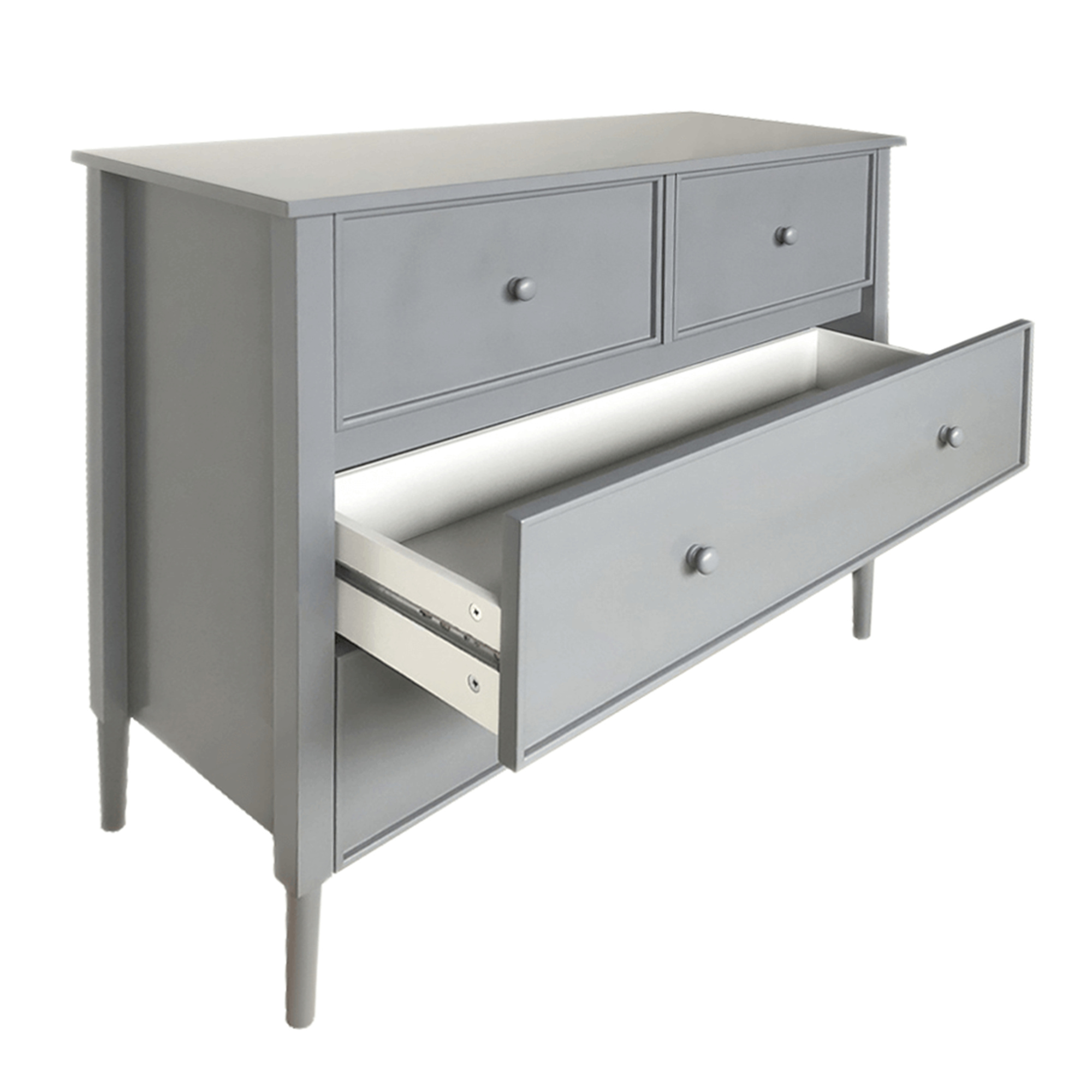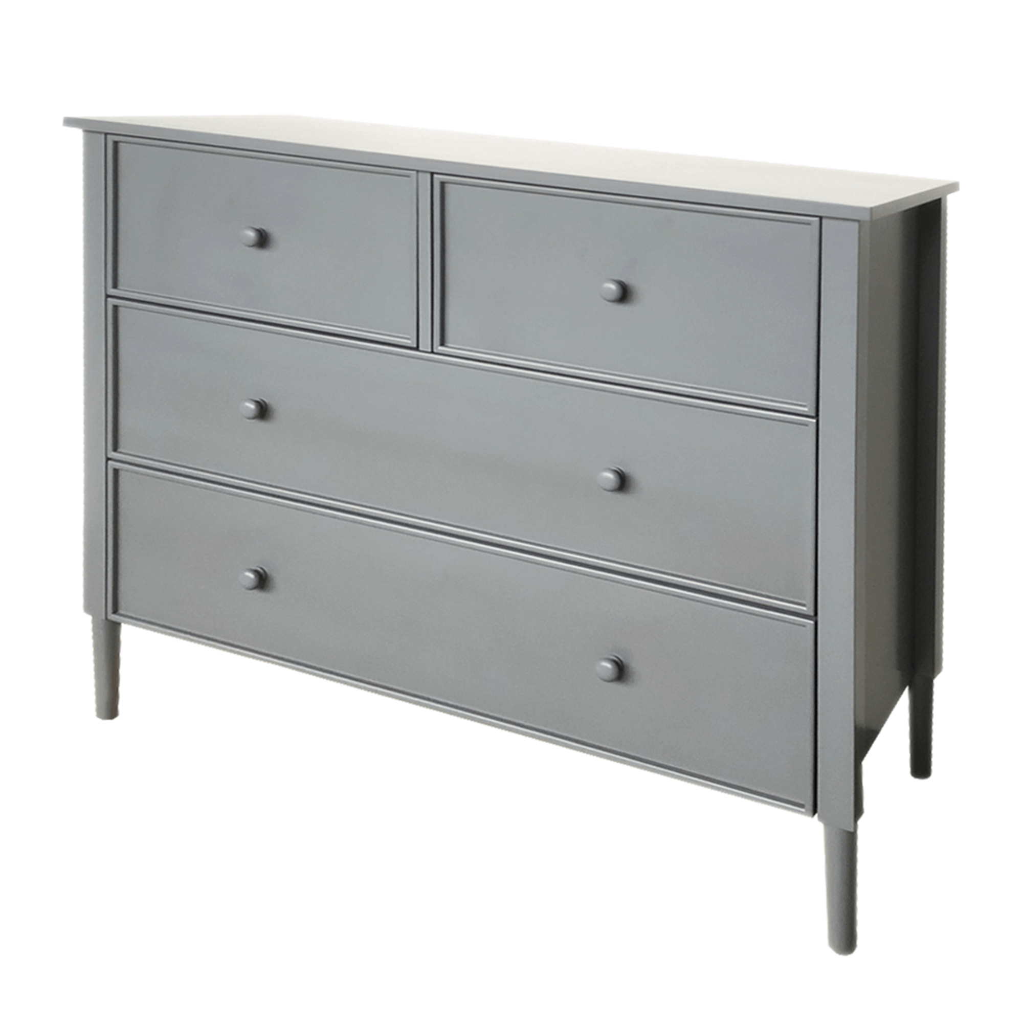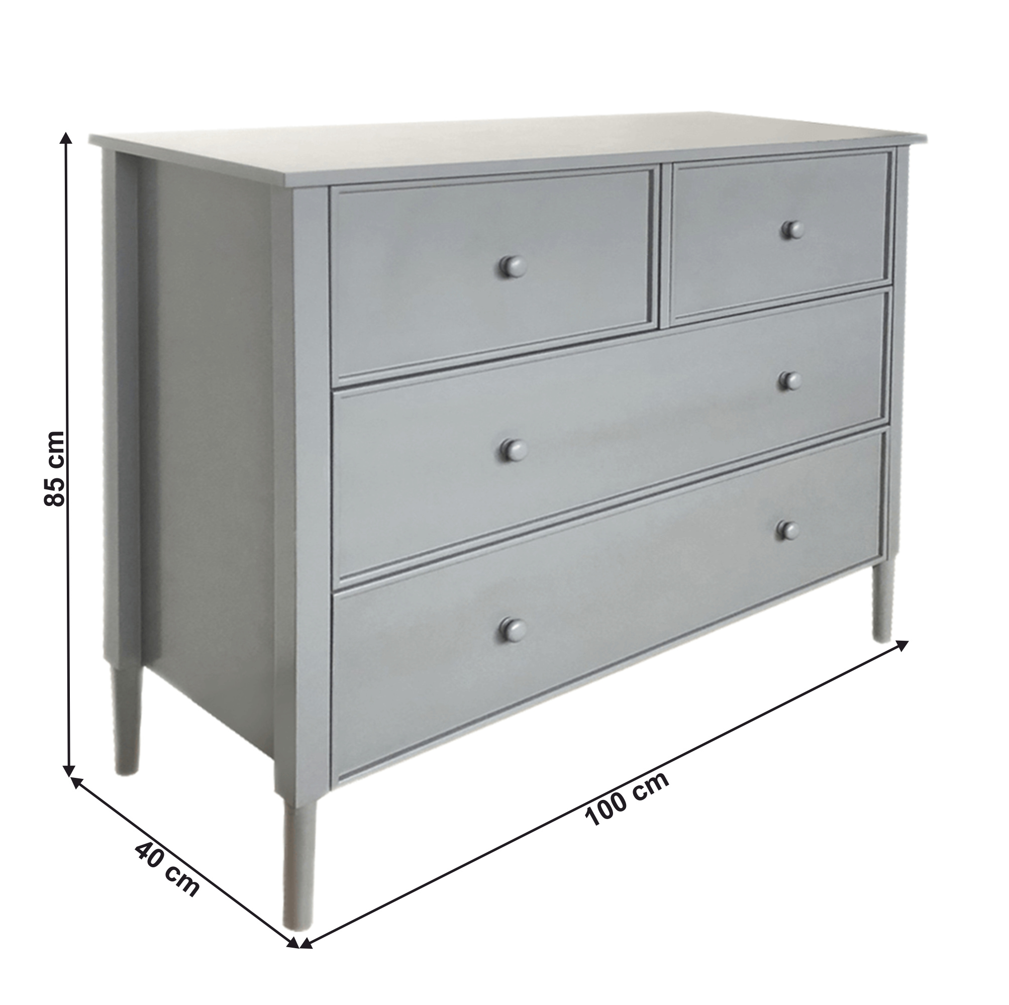 Materiál: MDF Barva: šedá Rozměry (ŠxHxV): 100x40x85 cm Tloušťka materiálu: 1,5 - 3,7 cm Dva větší šuplíky Dva menší šuplíky Dřevěné úchytky Barva úchytek: šedá Nosnoť: 30 kg Nosnost šuplíku: 10 kg Na nožičkách Výška nožiček: 15 cm Doporučujeme připevnit ke zdi Provensálský styl Dodáváno v demontu
