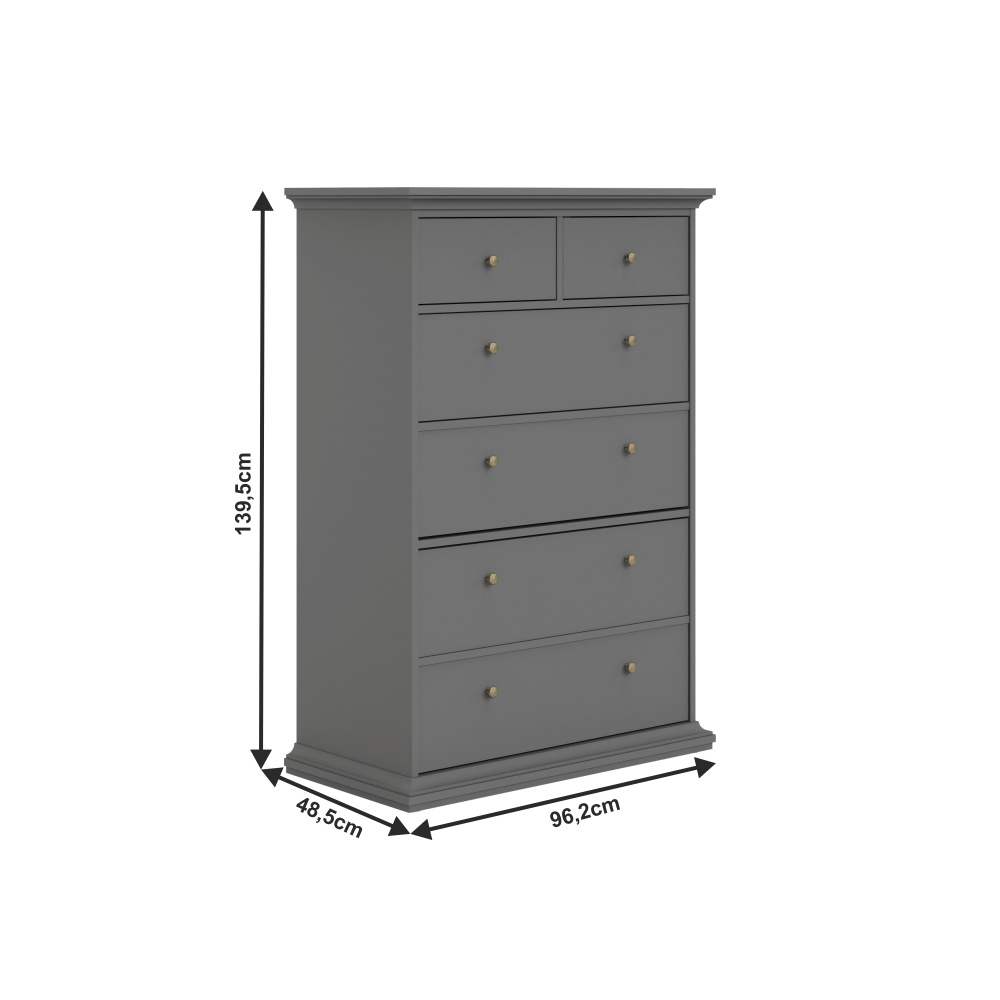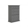 Materiál: DTD laminovaná/MDF lakovaná Barva: šedá Rozměry (ŠxHxV): 96,2x48,5x139,5 cm Tloušťka materiálu: 18 mm Šest šuplíků Kovové úchytky Provensálský styl Ozdobné lišty Dodáváno v demontu.