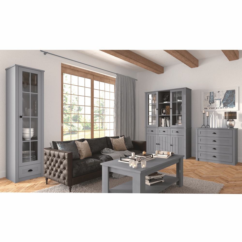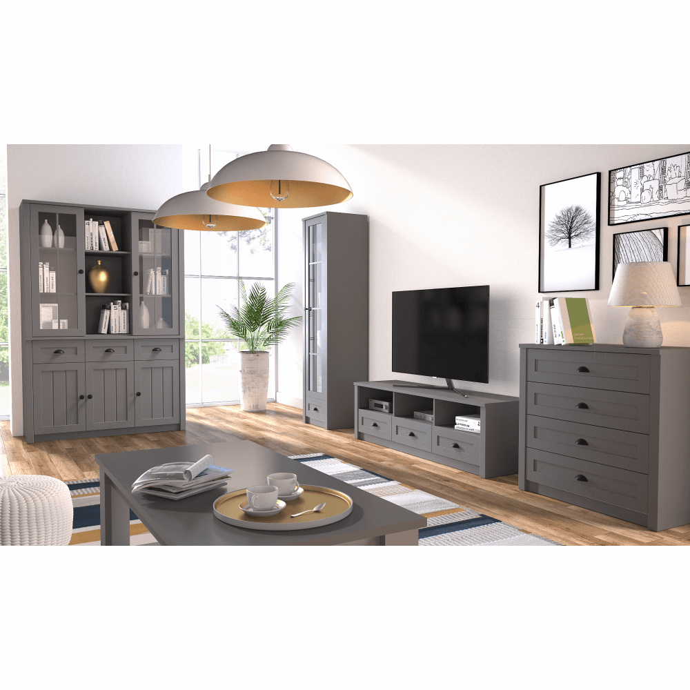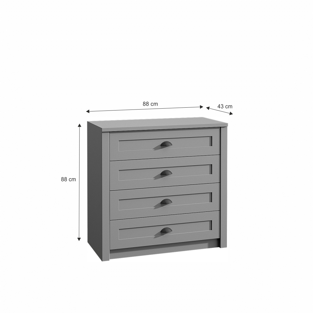 Materiál: DTD laminovaná Barva: šedá Rozměry (ŠxHxV): 88x43x88 cm Tloušťka materiálu korpus: 15 mm Tloušťka materiálu vrchní desky: 22 mm s šuplíky čtyři šuplíky Dodávané v demontu.