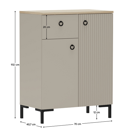Materiál: laminovaná DTD/fóliovaná MDF Barva: šedohnědá Taupe/dub silverjack Rozměry (ŠxHxV): 70x40,7x93,1 cm Tloušťka materiálu DTD: 1,6-1,8 cm Tloušťka materiálu MDF: 1,9 cm Dvoudveřová Policová Jedna zásuvka Výška zásuvky: 20 cm Nosnost vrchní desky: 10 kg Nosnost police: 5 kg Nosnost zásuvky: 3 kg S úchytkami Materiál úchytek: kov Barva úchytek: matná černá Na nožičkách Výška nožiček: 12 cm Materiál nožiček: plast Barva nožiček: matná černá Dekorativní frézovaná dvířka Moderní design Doporučujeme připevnit ke zdi Dodáváno v demontu