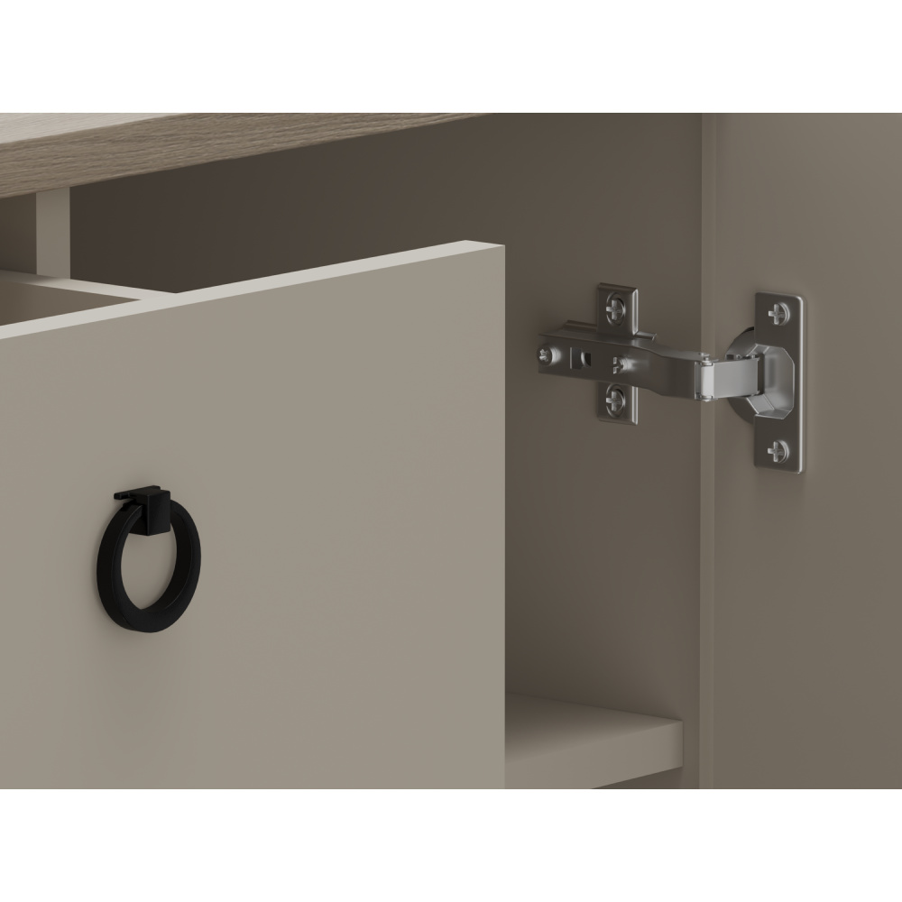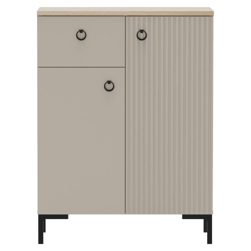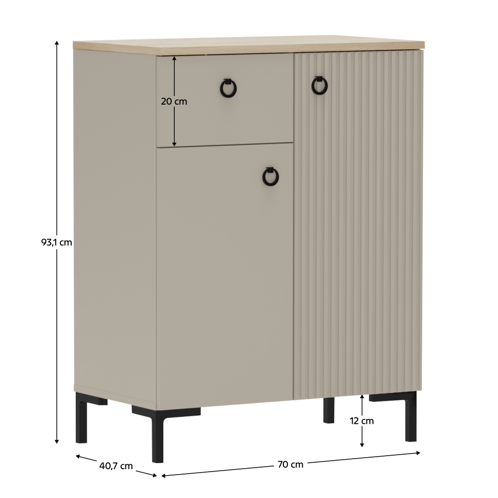 Materiál: laminovaná DTD/fóliovaná MDF Barva: šedohnědá Taupe/dub silverjack Rozměry (ŠxHxV): 70x40,7x93,1 cm Tloušťka materiálu DTD: 1,6-1,8 cm Tloušťka materiálu MDF: 1,9 cm Dvoudveřová Policová Jedna zásuvka Výška zásuvky: 20 cm Nosnost vrchní desky: 10 kg Nosnost police: 5 kg Nosnost zásuvky: 3 kg S úchytkami Materiál úchytek: kov Barva úchytek: matná černá Na nožičkách Výška nožiček: 12 cm Materiál nožiček: plast Barva nožiček: matná černá Dekorativní frézovaná dvířka Moderní design Doporučujeme připevnit ke zdi Dodáváno v demontu