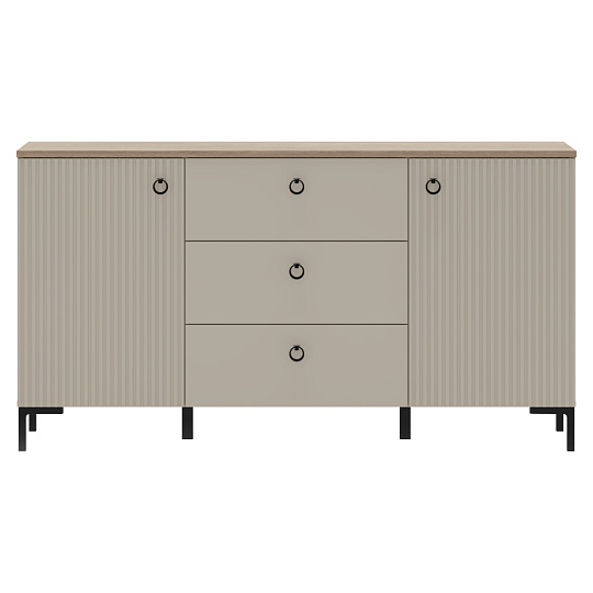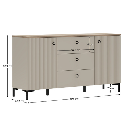 Materiál: laminovaná DTD/fóliovaná MDF Barva: šedohnědá Taupe/dub silverjack Rozměry (ŠxHxV): 150x40,7x80,9 cm Tloušťka materiálu DTD: 1,6-1,8 cm Tloušťka materiálu MDF: 1,9 cm Dvoudveřová Policová Tři zásuvky Rozměry zásuvka (ŠxV): 59,6x22 cm Nosnost vrchní desky: 10 kg Nosnost police: 5 kg Nosnost zásuvky: 3 kg S úchytkami Materiál úchytek: kov Barva úchytek: matná černá Na nožičkách Výška nožiček: 12 cm Materiál nožiček: plast Barva nožiček: matná černá Dekorativní frézovaná dvířka Moderní design Doporučujeme připevnit ke zdi Dodáváno v demontu