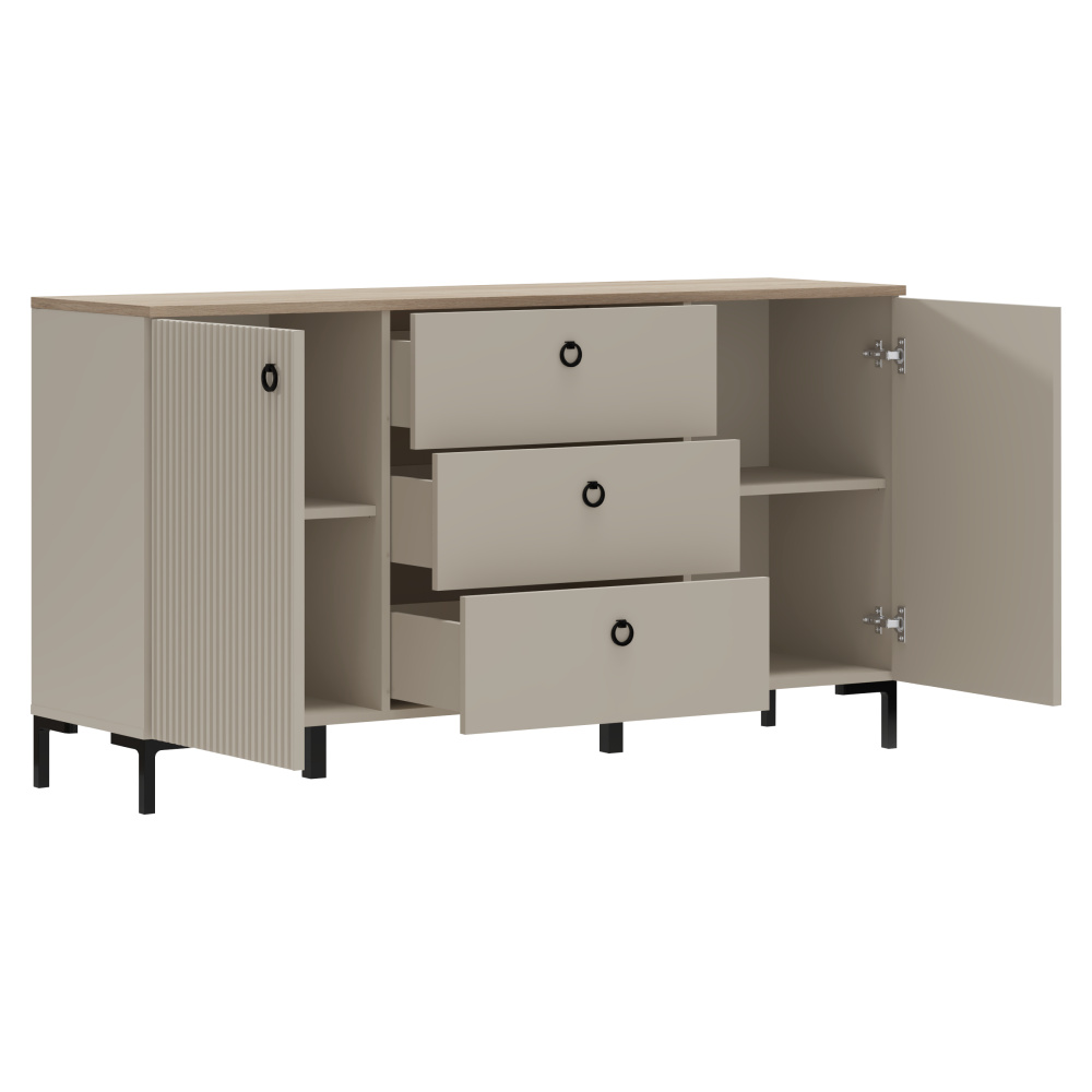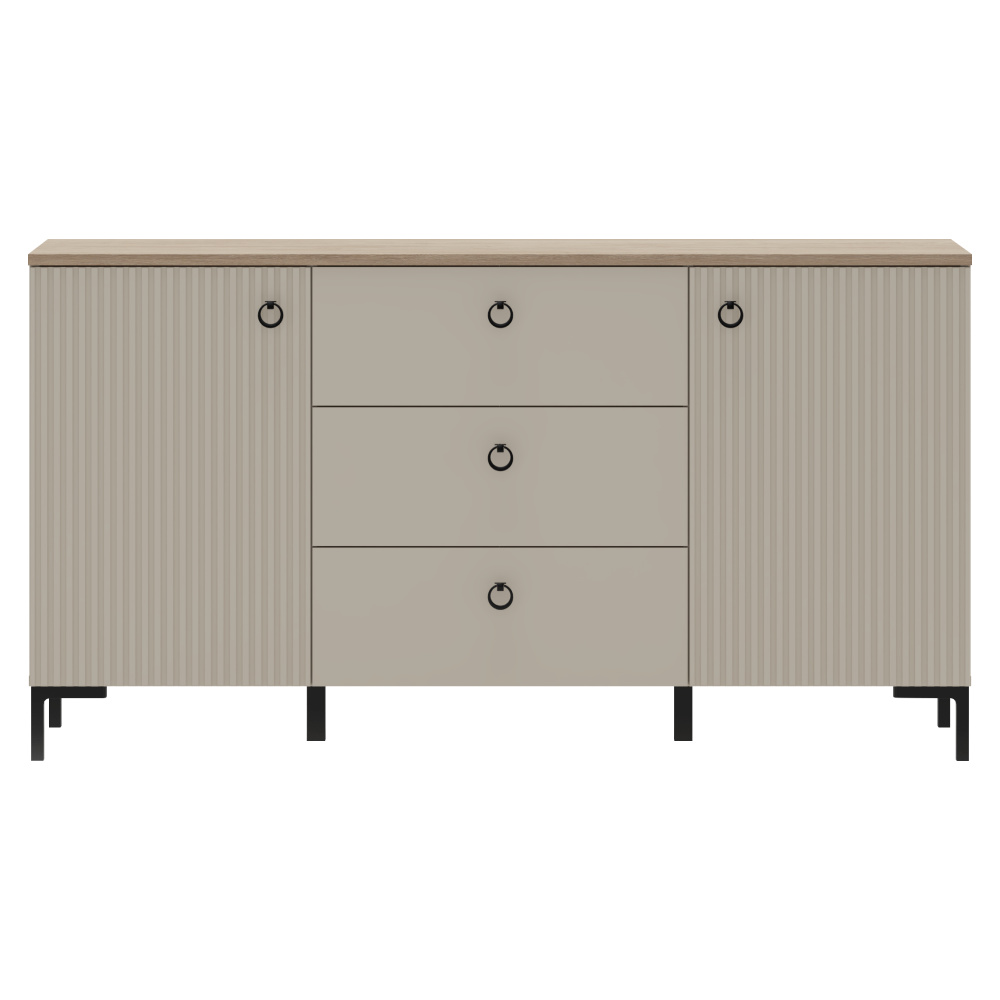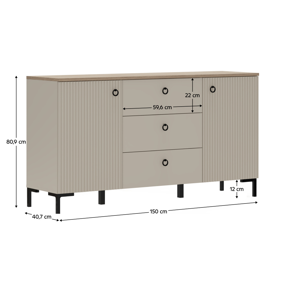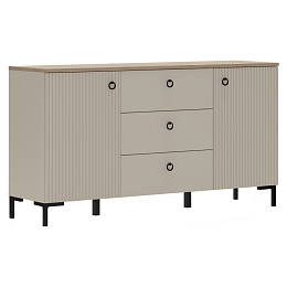 Materiál: laminovaná DTD/fóliovaná MDF Barva: šedohnědá Taupe/dub silverjack Rozměry (ŠxHxV): 150x40,7x80,9 cm Tloušťka materiálu DTD: 1,6-1,8 cm Tloušťka materiálu MDF: 1,9 cm Dvoudveřová Policová Tři zásuvky Rozměry zásuvka (ŠxV): 59,6x22 cm Nosnost vrchní desky: 10 kg Nosnost police: 5 kg Nosnost zásuvky: 3 kg S úchytkami Materiál úchytek: kov Barva úchytek: matná černá Na nožičkách Výška nožiček: 12 cm Materiál nožiček: plast Barva nožiček: matná černá Dekorativní frézovaná dvířka Moderní design Doporučujeme připevnit ke zdi Dodáváno v demontu