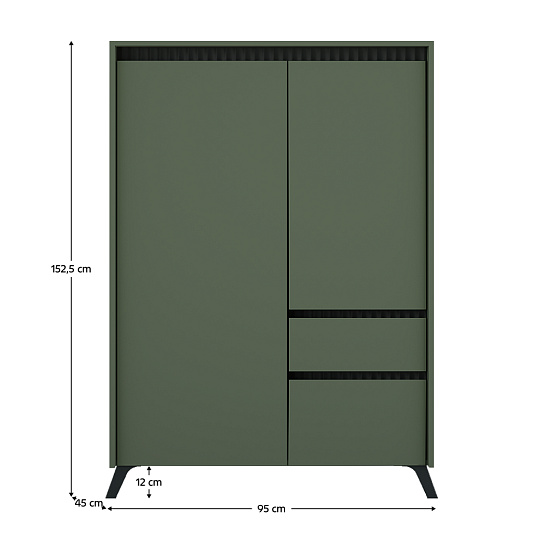 Materiál: laminovaná DTD/fóliovaná MDF/PVC fólie Barva: smoke zelená/černá Rozměry (ŠxHxV): 95x45x152,5 cm Tloušťka materiálu: 1,6-1,9 cm Dvoudveřová Výklopná skříňka Jedna zásuvka Police Na nožičkách Barva nožiček: černá Výška nožiček: 12 cm Plnovýsuvné kuličkové ložisko Panty Hrana : papír impregnovaný termosetovými polymery/PVC Tloušťka materiálu ABS: 0,5 mm Tloušťka dřevovláknité desky zadní strana/dno zásuvky: 0,3 cm Barva zadní strana/dno zásuvky: tmavý dub milán Dekorativní frézování Bez úchytek Moderní design Dodáváno v demontu
