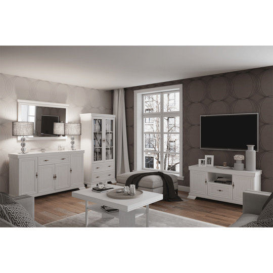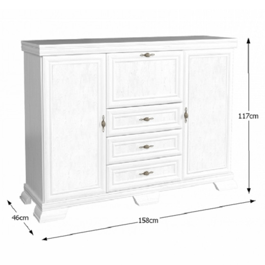 Komoda KORA KK6P NEW Materiál: laminovaná DTD/MDF Barva: sosna andersen Rozměry (ŠxHxV): 158x46x117 cm Tloušťka materiálu korpus: 15 mm Tloušťka materiálu vrchní desky: 22 mm Tloušťka materiálu dolní desky: 22 mm Výška spodního prostoru od podlahy: 10,5 cm Rustikální styl Ozdobné lišty Kovové úchytky Tři šuplíky Dvě skříňky Barová skříňka Dodáváno v demontu