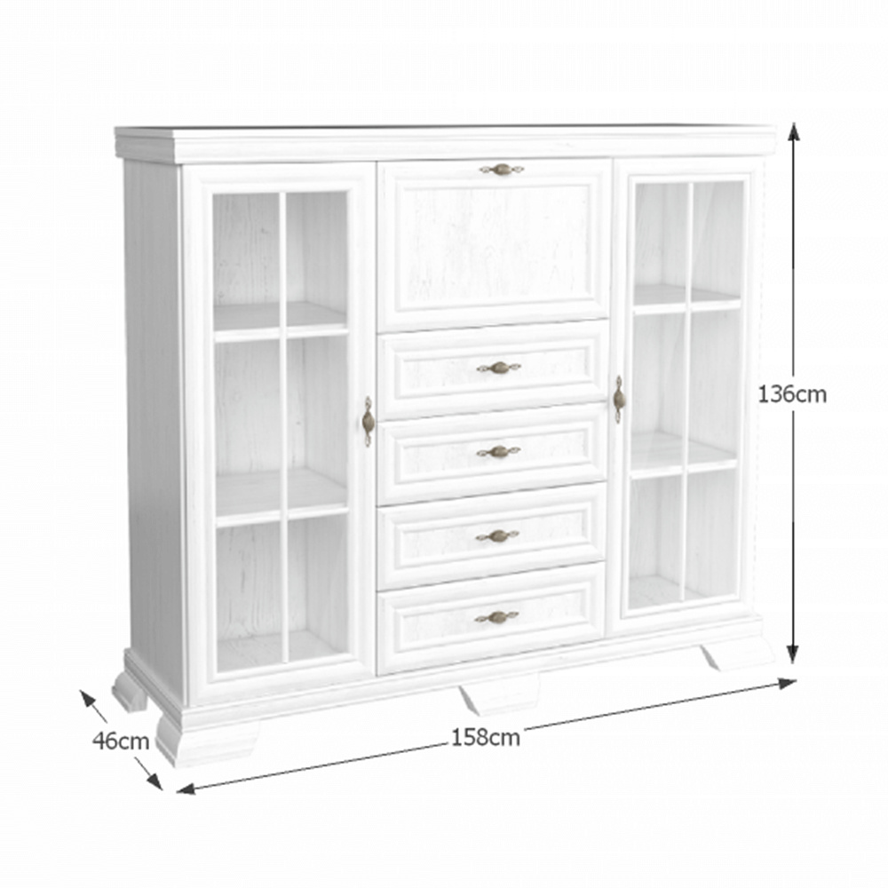 Komoda KORA KK7 Materiál: laminovaná DTD/MDF/sklo Barva: sosna andersen Rozměry (ŠxHxV): 158x46x136 cm Tloušťka materiálu korpus: 15 mm Tloušťka materiálu vrchní desky: 22 mm Tloušťka materiálu dolní desky: 22 mm Výška spodního prostoru od podlahy: 10,5 cm Rustikální styl Ozdobné lišty Kovové úchytky Čtyři šuplíky Dvě skříňky Barová skříňka Dodáváno v demontu