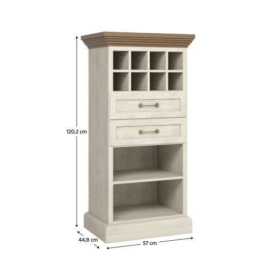 Materiál: DTD laminovaná/ozdobné lišty/kov Barva: sosna nordická/dub divoký Rozměry (ŠxHxV): 57x44,8x120,2 cm Výška podstavce: 9 cm Výška vrchní desky: 8 cm Tloušťka materiálu korpus: 1,5 cm Tloušťka materiálu vrchní desky: 2,2 cm Nosnost šuplíku a police: 5 kg Dva šuplíky Kovové úchytky Otevřený úložný prostor Dodáváno v demontu