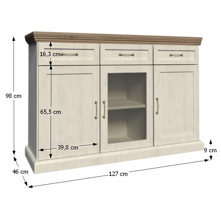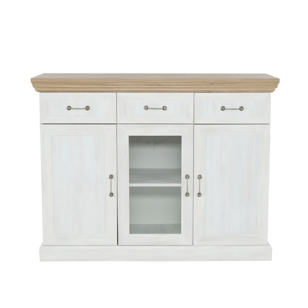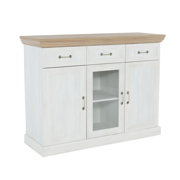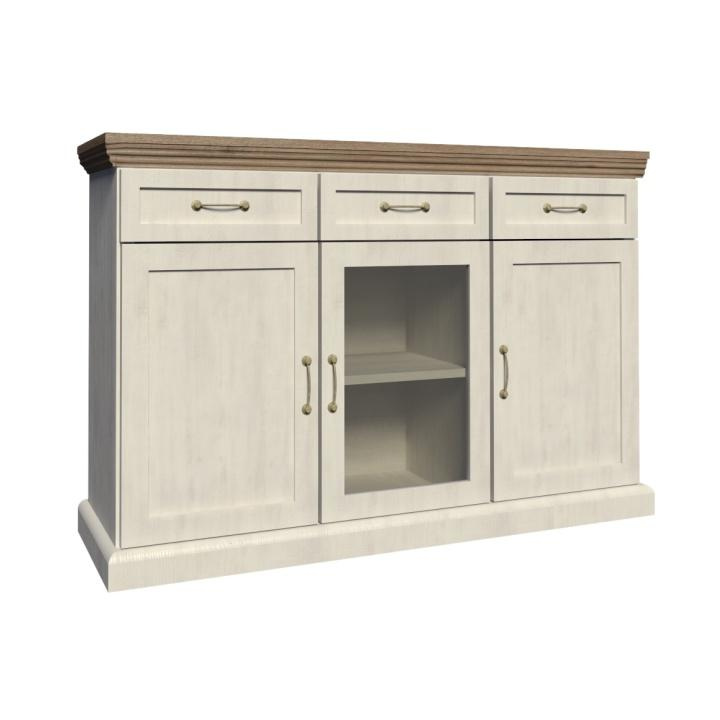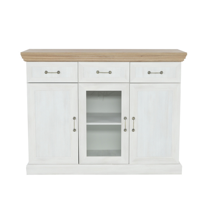 Komoda K1S, třídveřová, se třemi šuplíky, z elegantního sektorového systému Royal v provensálském stylu. Vhodný na zařízení obývacích pokojů či ložnic. Materiál: korpus DTD laminovaná + ozdobné lišty, kovové úchytky Barevné provedení: sosna skandinávská v kombinaci s dubem divokým. Rozměry ŠxHxV: 127x46x98 cm Tloušťka materiálu korpus: 15 mm Tloušťka materiálu vrchní desky: 22 mm Dodávané v demontu.