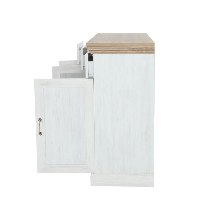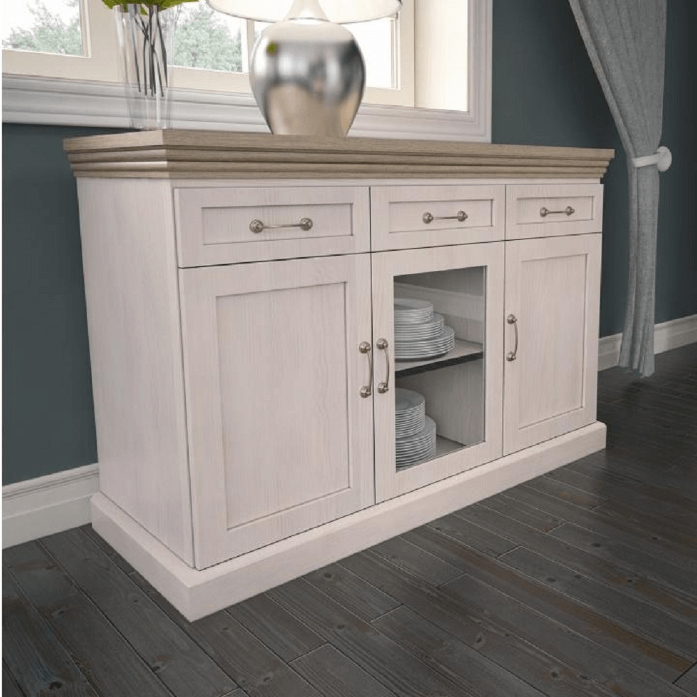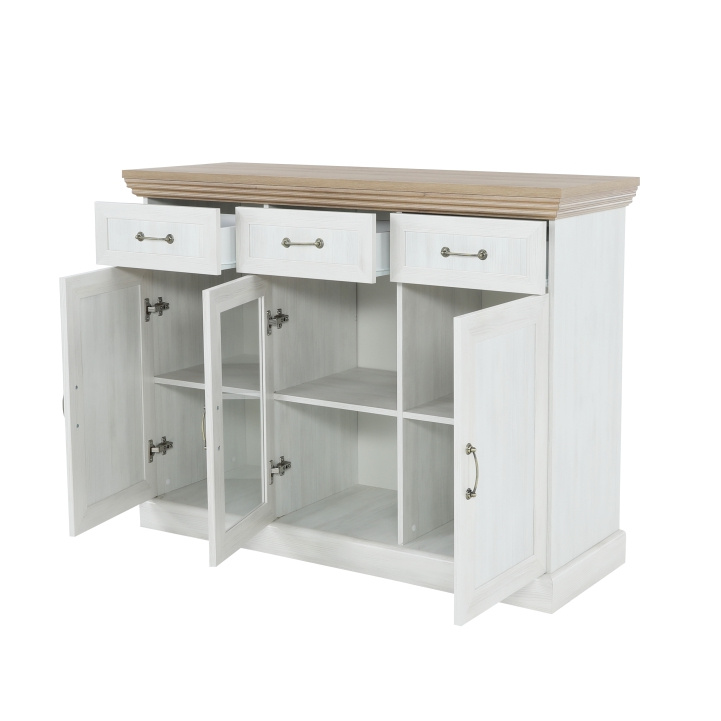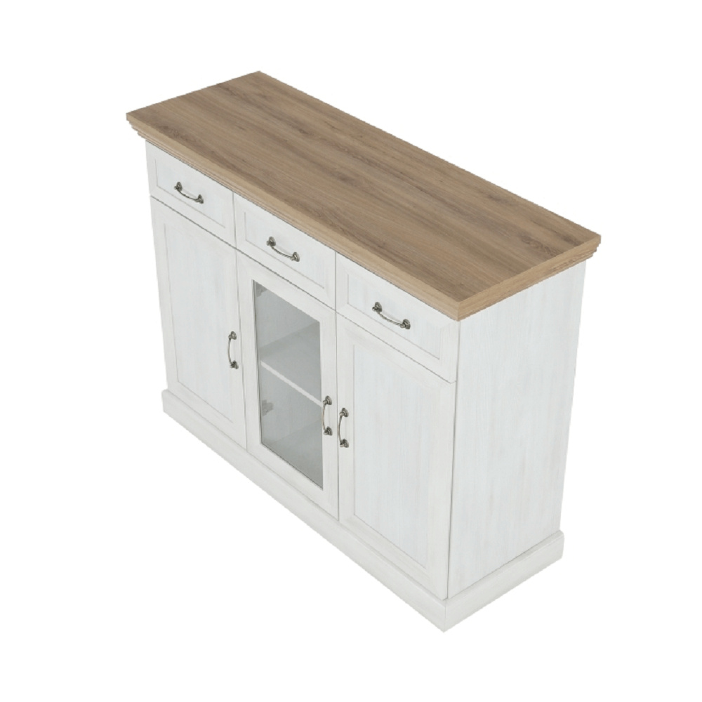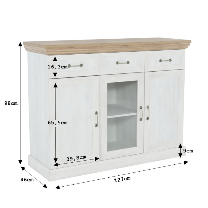 Komoda K1S, třídveřová, se třemi šuplíky, z elegantního sektorového systému Royal v provensálském stylu. Vhodný na zařízení obývacích pokojů či ložnic. Materiál: korpus DTD laminovaná + ozdobné lišty, kovové úchytky Barevné provedení: sosna skandinávská v kombinaci s dubem divokým. Rozměry ŠxHxV: 127x46x98 cm Tloušťka materiálu korpus: 15 mm Tloušťka materiálu vrchní desky: 22 mm Dodávané v demontu.