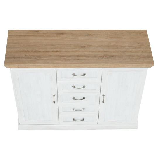 Komoda K2D, dvoudveřová s pěti šuplíky z elegantního sektorového systému Royal v provensálském stylu. Vhodná na zařízení obývacích pokojů či ložnic. Materiál: korpus DTD laminovaná + ozdobné lišty, kovové úchytky Barevné provedení: sosna skandinávská / dub divoký Rozměry ŠxHxV: 127x46x98 cm Tloušťka materiálu korpus: 15 mm Tloušťka materiálu vrchní desky: 22 mm Dodávané v demontu.