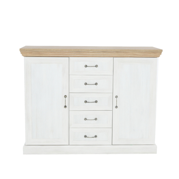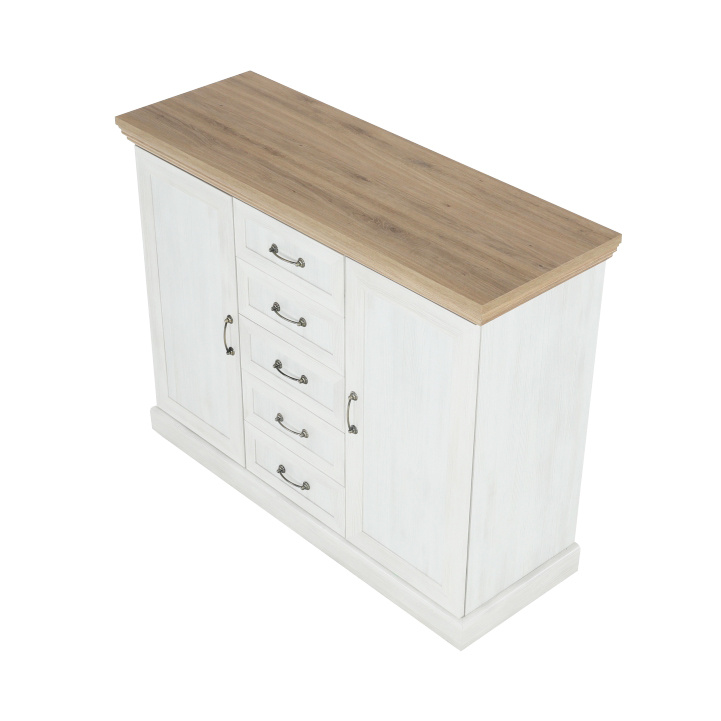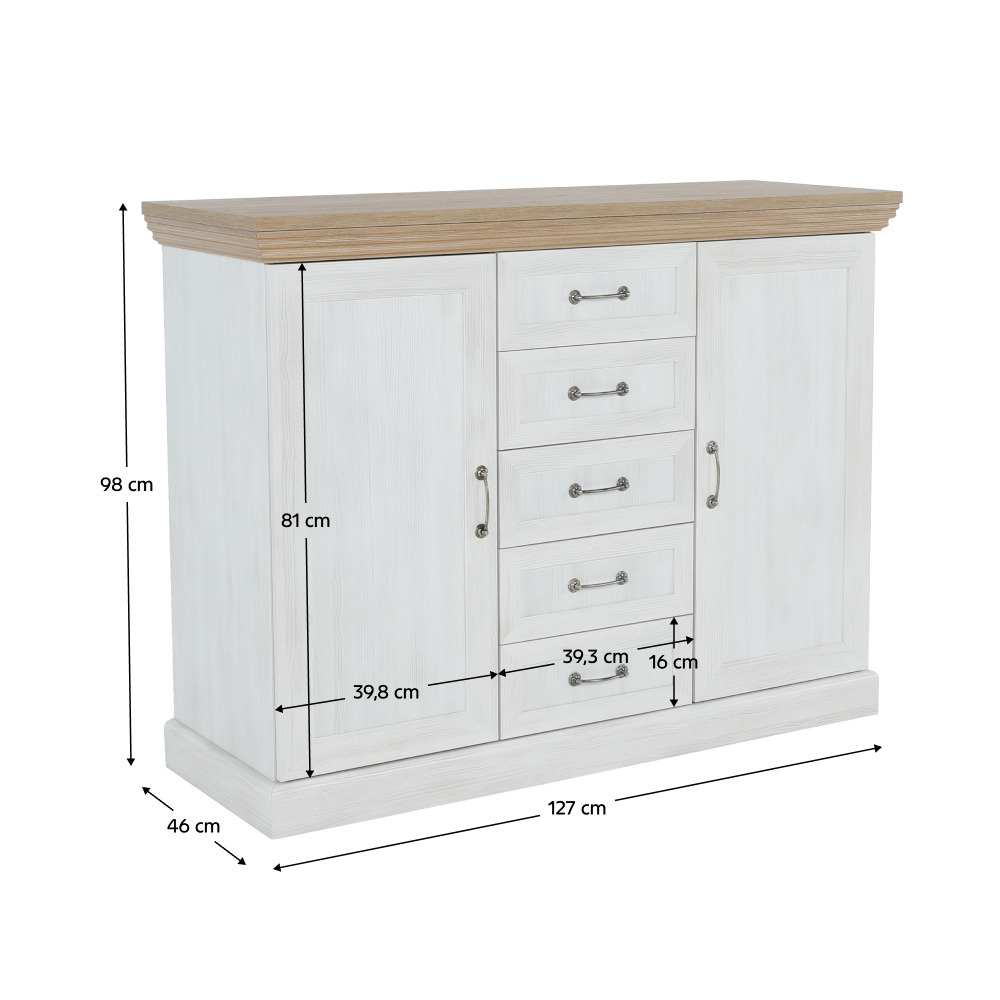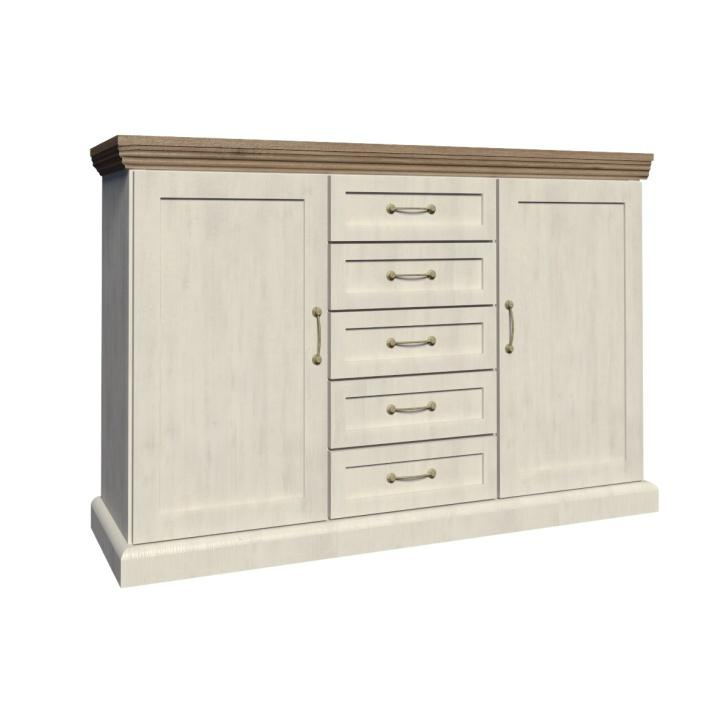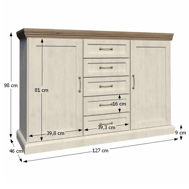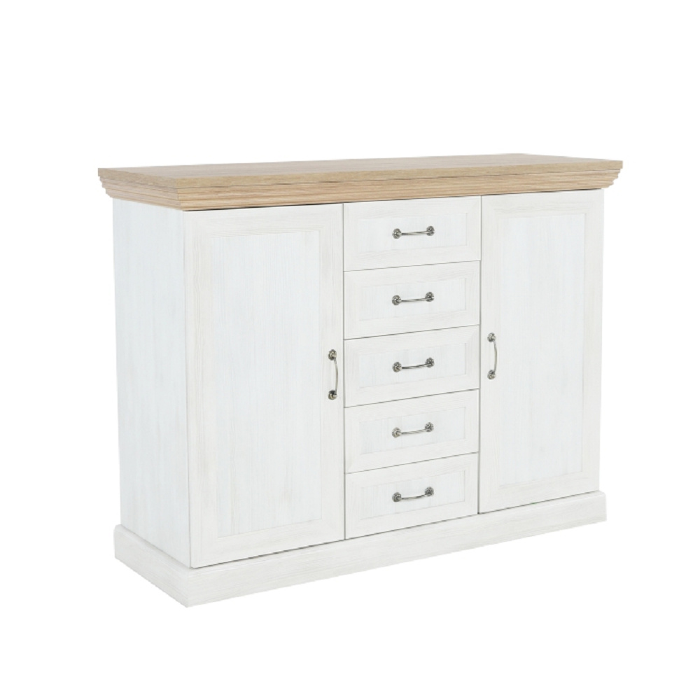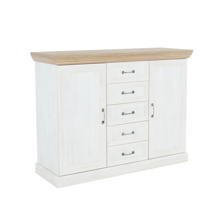 Komoda K2D, dvoudveřová s pěti šuplíky z elegantního sektorového systému Royal v provensálském stylu. Vhodná na zařízení obývacích pokojů či ložnic. Materiál: korpus DTD laminovaná + ozdobné lišty, kovové úchytky Barevné provedení: sosna skandinávská / dub divoký Rozměry ŠxHxV: 127x46x98 cm Tloušťka materiálu korpus: 15 mm Tloušťka materiálu vrchní desky: 22 mm Dodávané v demontu.