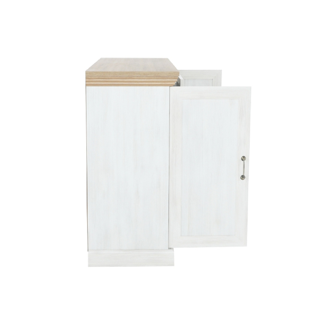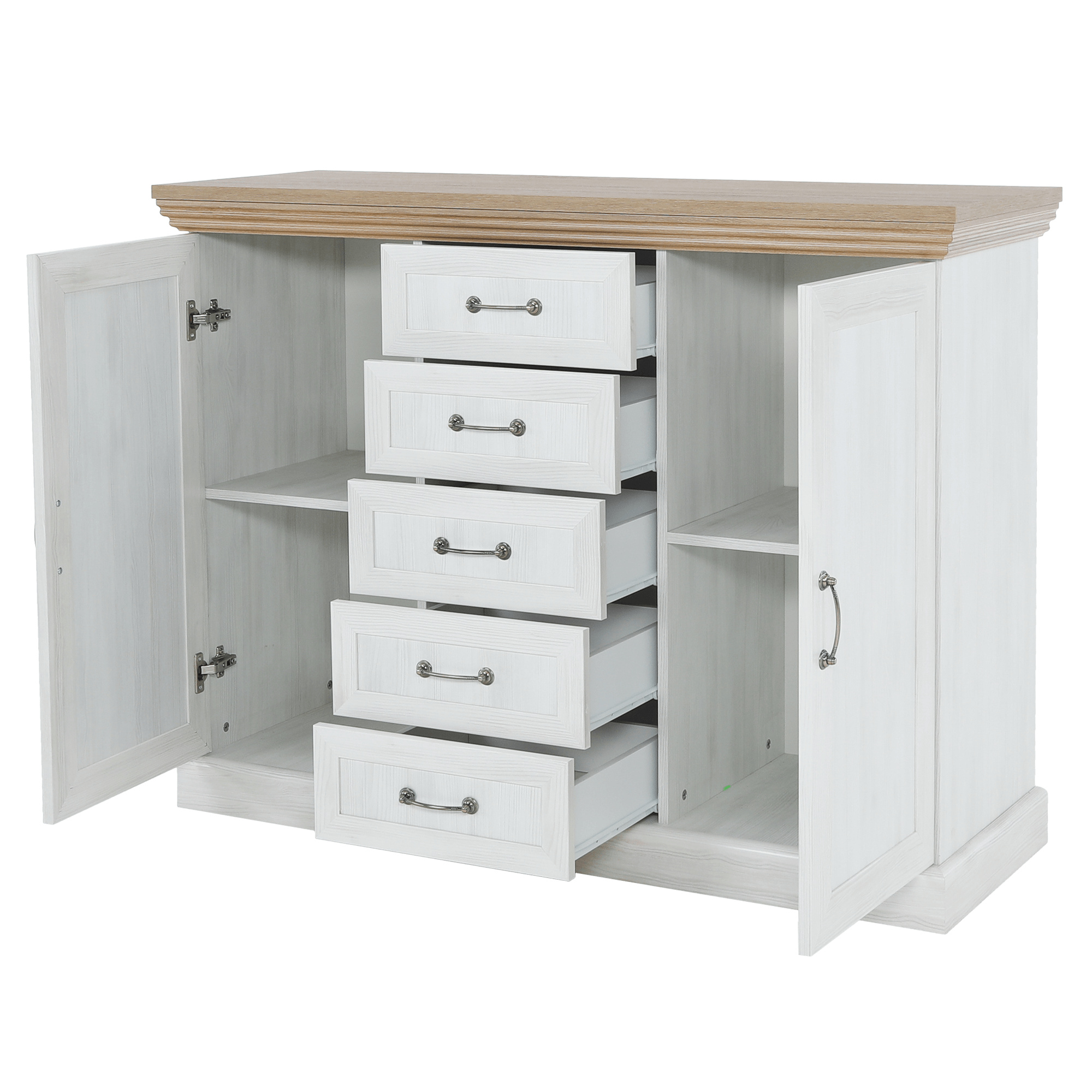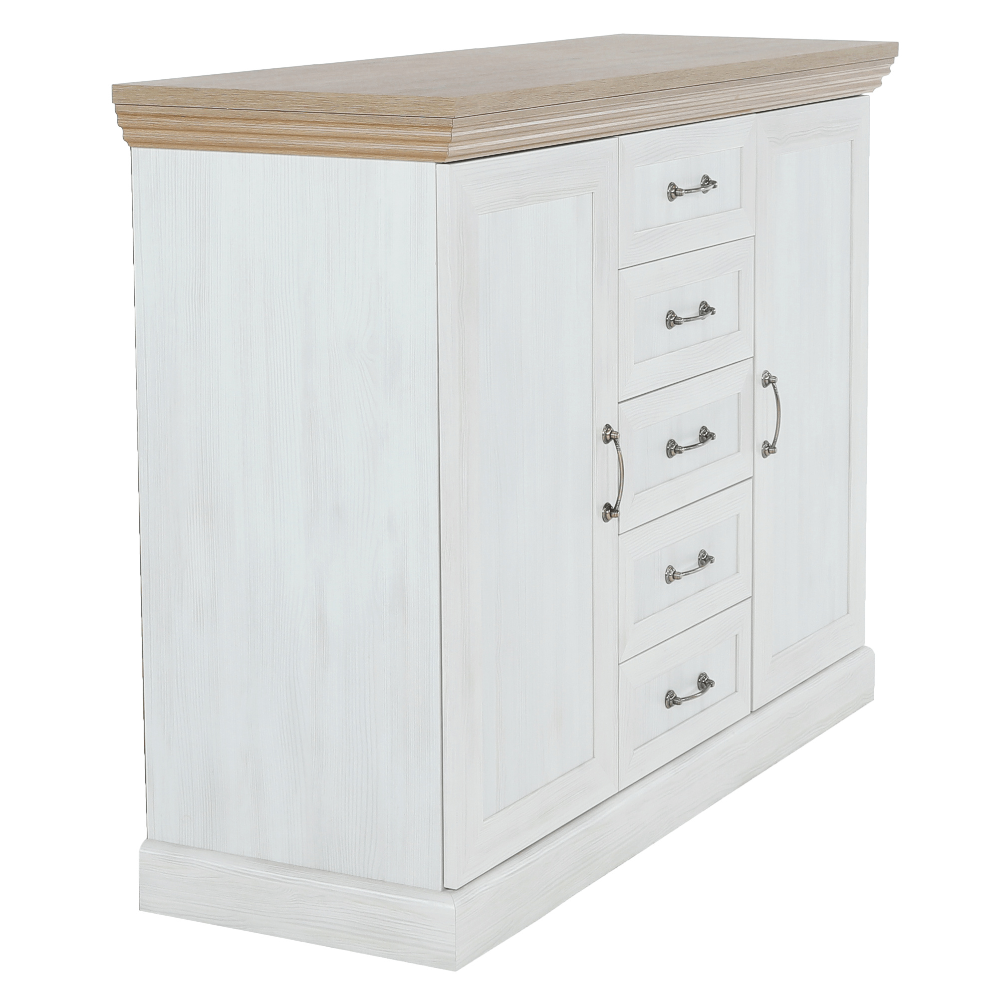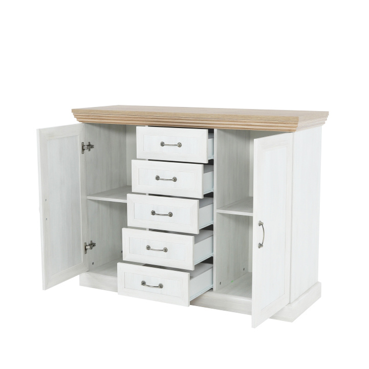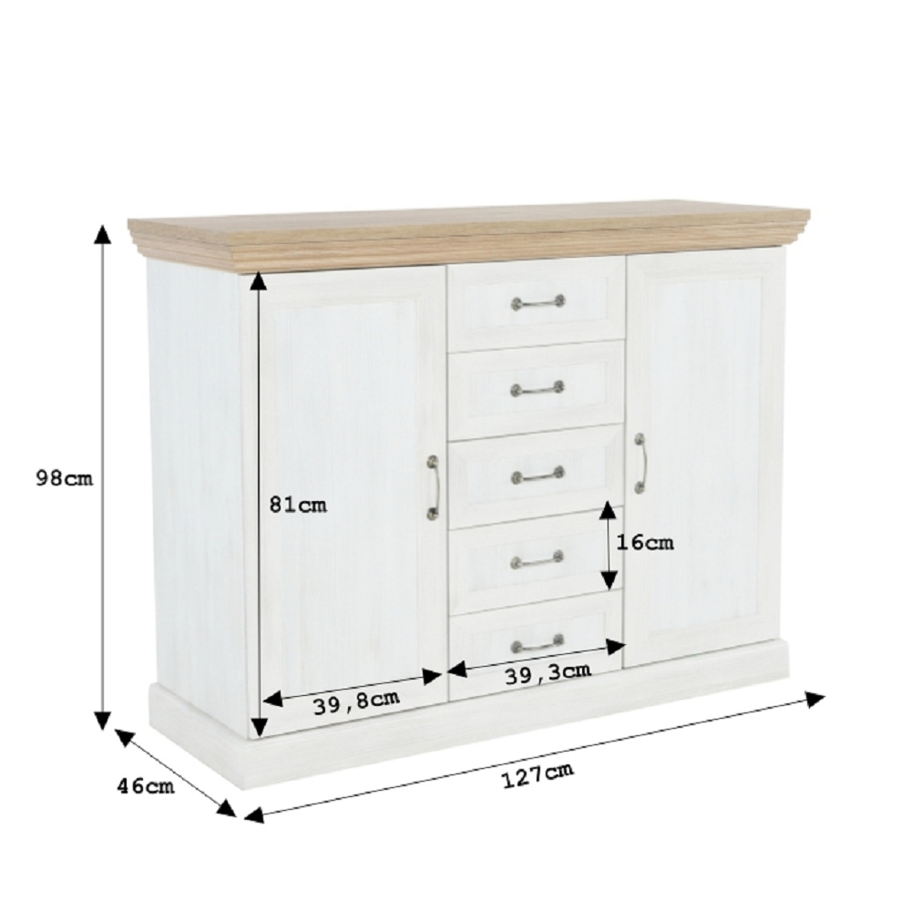 Komoda K2D, dvoudveřová s pěti šuplíky z elegantního sektorového systému Royal v provensálském stylu. Vhodná na zařízení obývacích pokojů či ložnic. Materiál: korpus DTD laminovaná + ozdobné lišty, kovové úchytky Barevné provedení: sosna skandinávská / dub divoký Rozměry ŠxHxV: 127x46x98 cm Tloušťka materiálu korpus: 15 mm Tloušťka materiálu vrchní desky: 22 mm Dodávané v demontu.