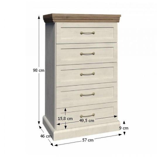 Komoda KS5 s pěti šuplíky z elegantního sektorového systému Royal v provensálském stylu. Vhodná na zařízení obývacích pokojů či ložnic. Materiál: korpus DTD laminovaná + ozdobné lišty, kovové úchytky Barevné provedení: sosna skandinávská / dub divoký Rozměry ŠxHxV: 57x46x98 cm Tloušťka materiálu korpus: 15 mm Tloušťka materiálu vrchní desky: 22 mm Dodávané v demontu.