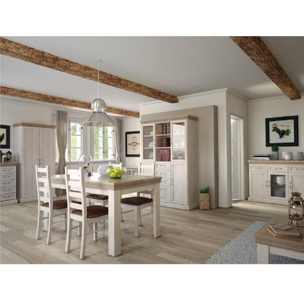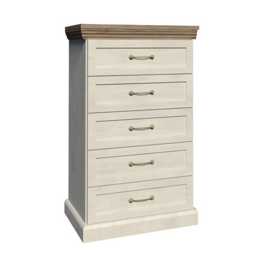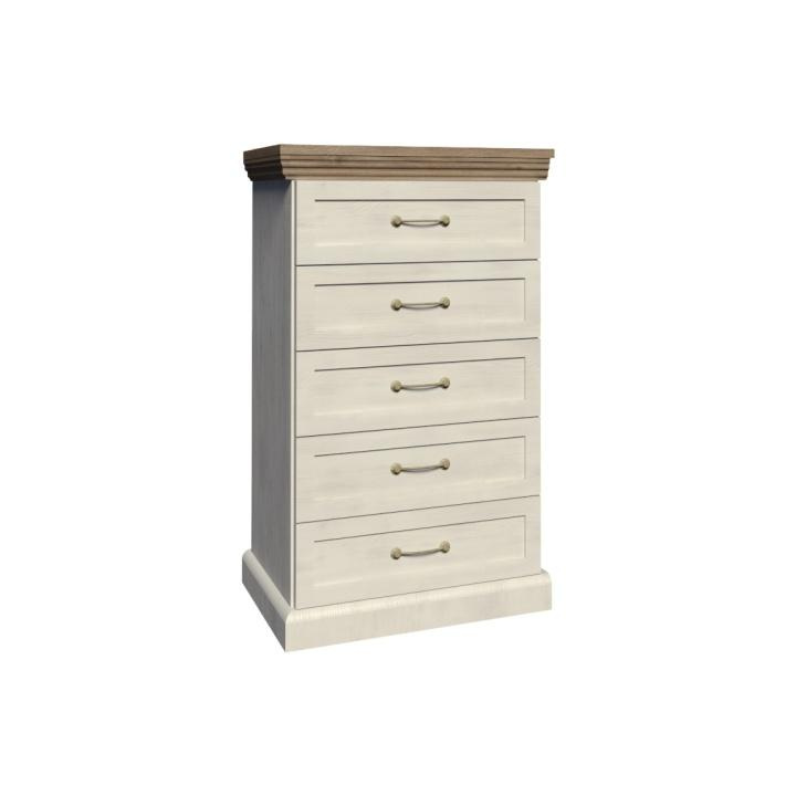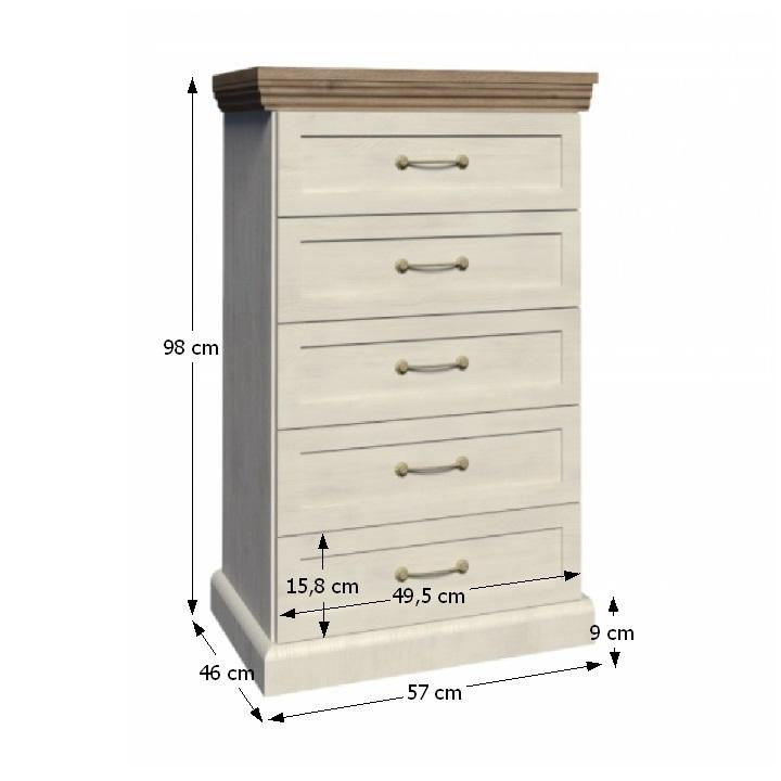 Komoda KS5 s pěti šuplíky z elegantního sektorového systému Royal v provensálském stylu. Vhodná na zařízení obývacích pokojů či ložnic. Materiál: korpus DTD laminovaná + ozdobné lišty, kovové úchytky Barevné provedení: sosna skandinávská / dub divoký Rozměry ŠxHxV: 57x46x98 cm Tloušťka materiálu korpus: 15 mm Tloušťka materiálu vrchní desky: 22 mm Dodávané v demontu.
