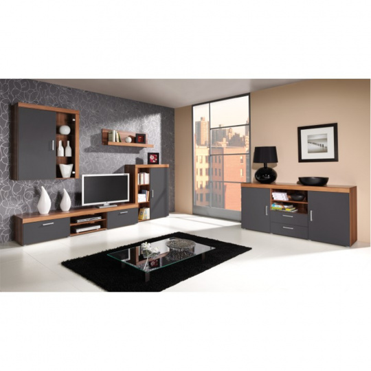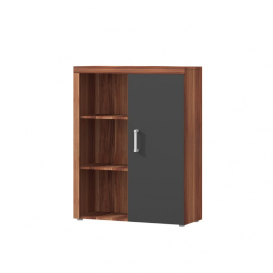 Materiál: DTD laminovaná Barva: švestka / šedý grafit Rozměry (ŠxHxV): 90x35x114 cm Tloušťka materiálu: 16 mm 1-dveřová otevřený regál policová Dodávané v demontu