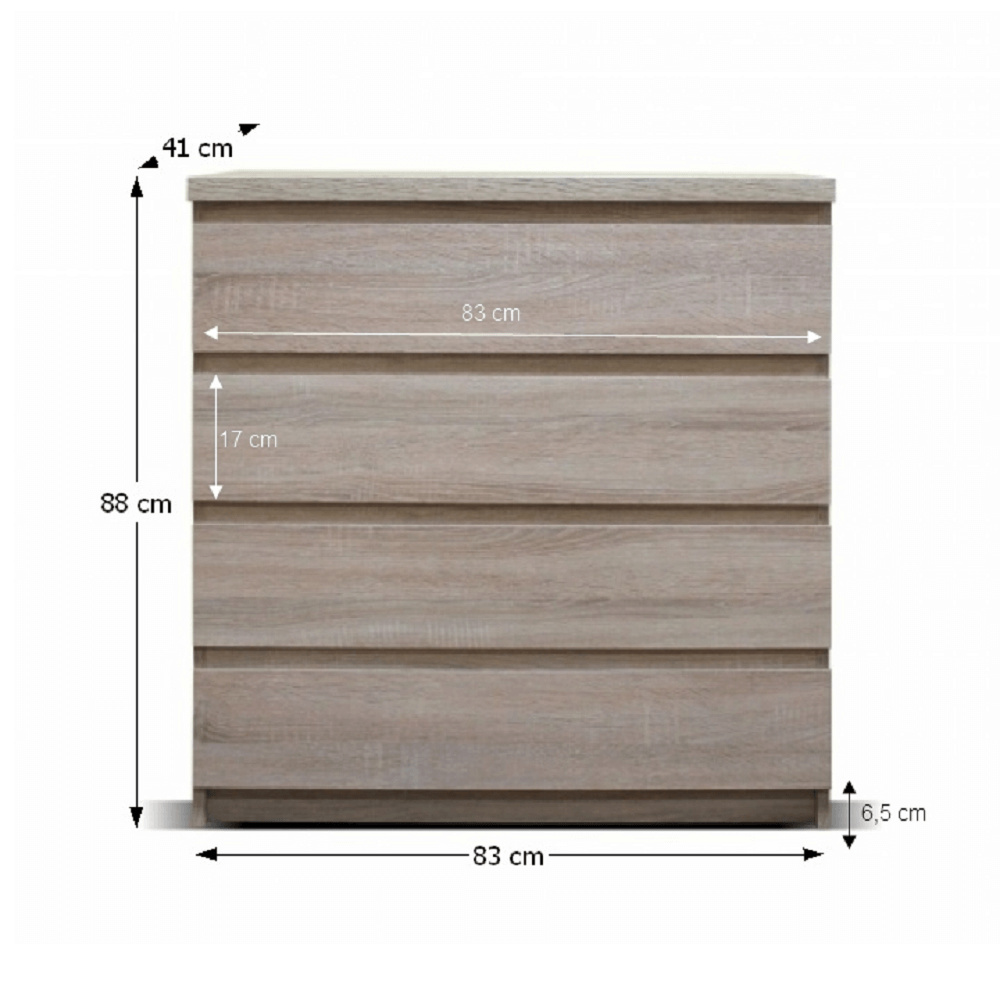 Komoda čtyřzásuvková, TYP 05. Materiál: DTD laminovaná, ABS hrany. Barevné provedení: dub sonoma. Rozměry ŠxHxV: 83x41x88 cm. Tloušťka materiálu korpus: 16 mm Tloušťka materiálu vrchní desky: 25 mm Dodávané v demontu.