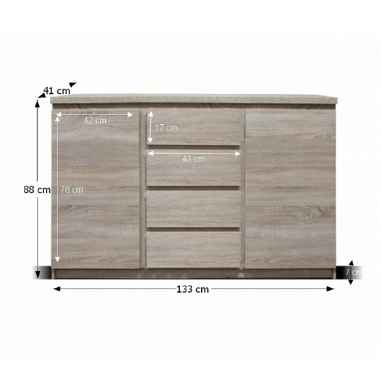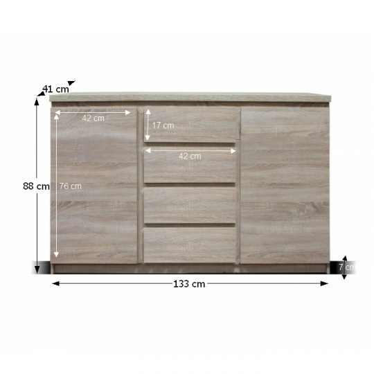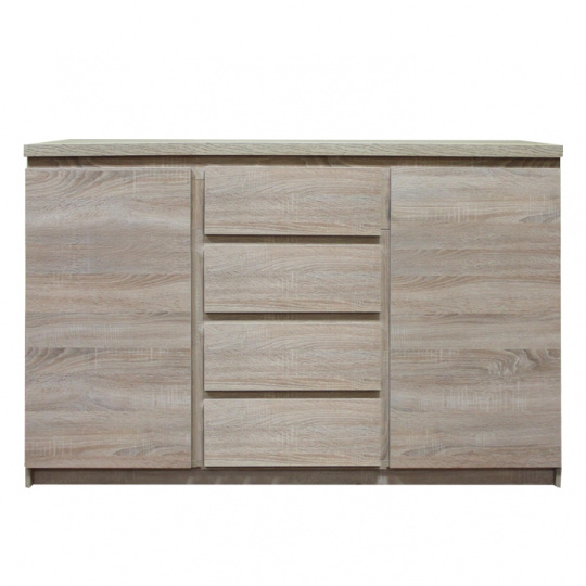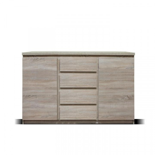 Komoda dvoudveřová, čtyřzásuvková, TYP 08. Materiál: DTD laminovaná, ABS hrany. Barevné provedení: dub sonoma. Rozměry ŠxHxV: 133x41x88 cm. Tloušťka materiálu korpus: 16 mm Tloušťka materiálu vrchní desky: 25 mm Dodávané v demontu.