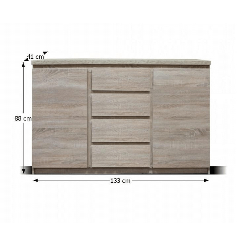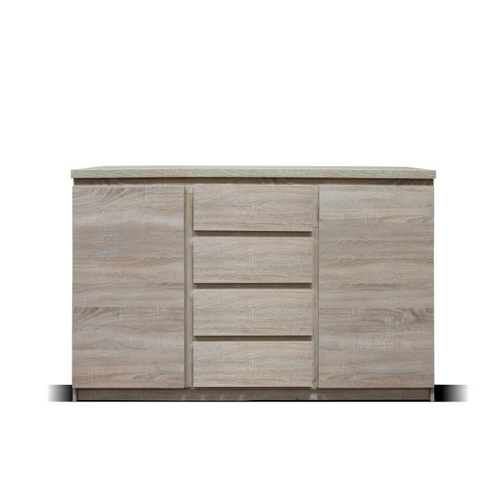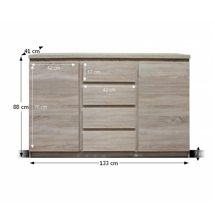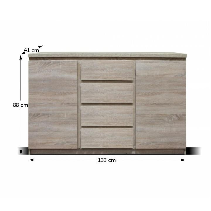 Komoda dvoudveřová, čtyřzásuvková, TYP 08. Materiál: DTD laminovaná, ABS hrany. Barevné provedení: dub sonoma. Rozměry ŠxHxV: 133x41x88 cm. Tloušťka materiálu korpus: 16 mm Tloušťka materiálu vrchní desky: 25 mm Dodávané v demontu.