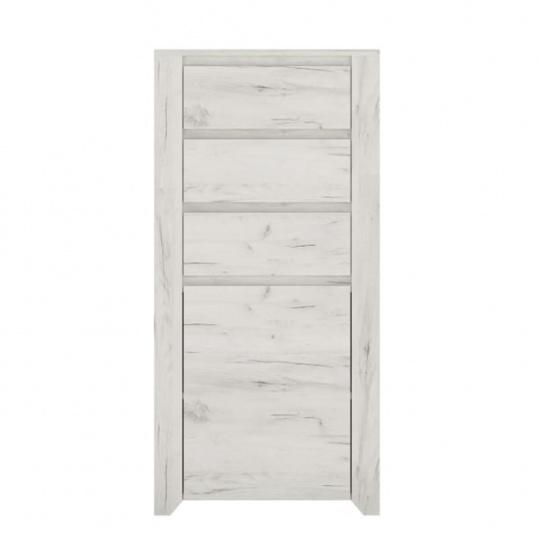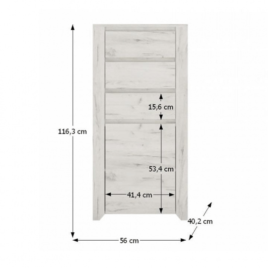 Jednodveřová skříň TYP 10 ze sektorové sestavy ANGEL, skříňka a tři šuplíky Materiál: laminovaná DTD Barva: bílá craft Rozměry (ŠxHxV): 56x40,2x190,5 cm Tloušťka materiálu: 16 mm Výška spodního prostoru od podlahy: 2,5 cm Dodávané v demontu Hmotnost: 50kg