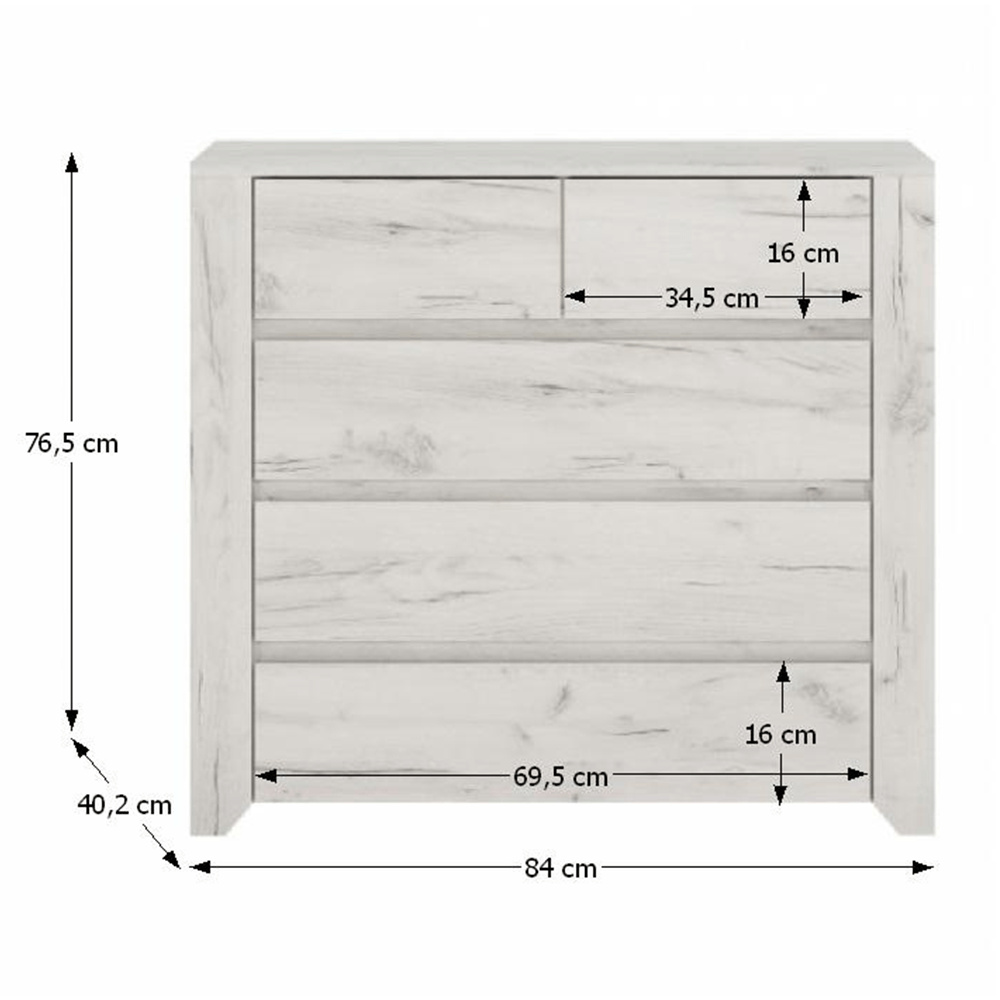 Komoda TYP 43 ze sektorové sestavy ANGEL s pěti šuplíky Materiál: laminovaná DTD Barva: bílá craft Rozměry (ŠxHxV): 84x40,2x76,5 cm Tloušťka materiálu: 16 mm Výška spodního prostoru od podlahy: 2,5 cm Dodávané v demontu
