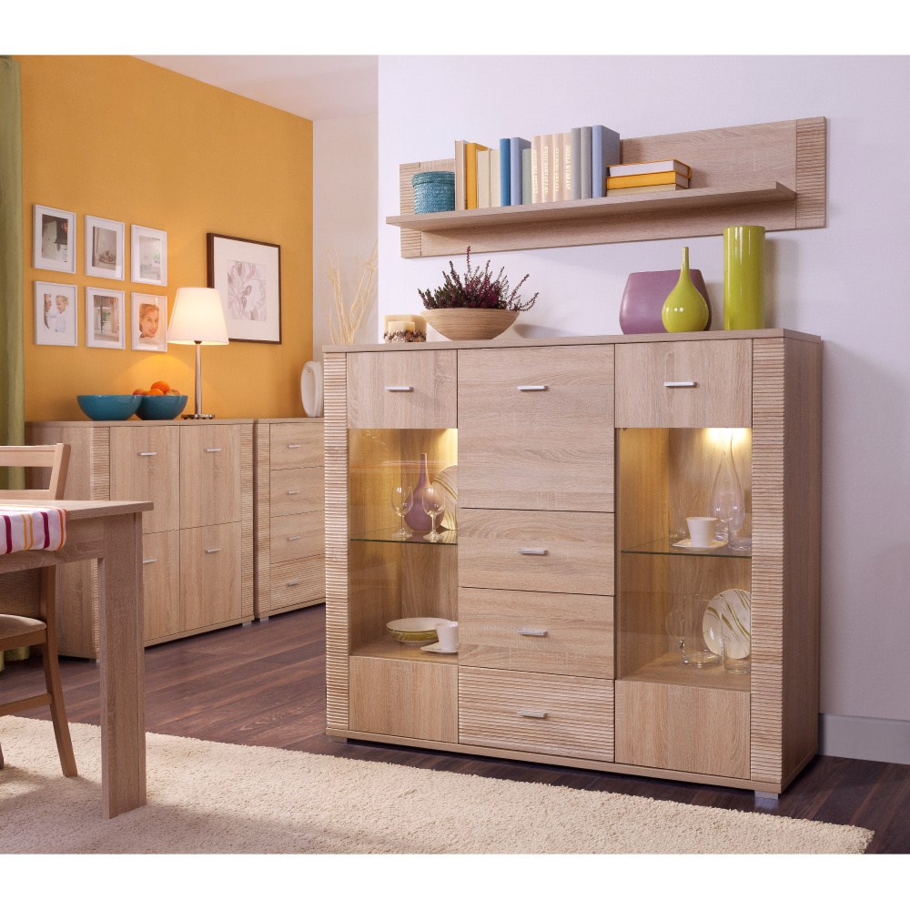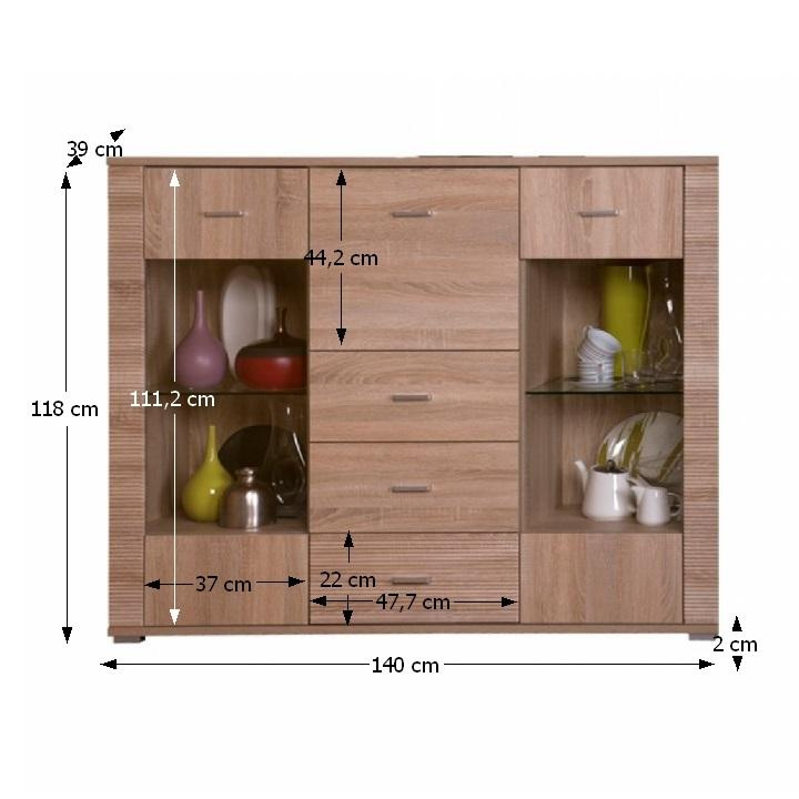 Komoda s barem typ 08, vhodný na zařízení obývacích pokojů, ložnic i pracoven, materiál: DTD laminovaná. Hrany jednotlivých komponentů jsou ukončeny vroubkovanou lištou. Barevné provedení: dub sonoma. Rozměry (ŠxVxH): 140x118x39 cm. Tloušťka materiálu korpus: 16 mm Tloušťka materiálu vrchní desky: 22 mm Tloušťka materiálu spodní desky: 22 mm Dodávána v demontu, skladem - ihned k odběru.