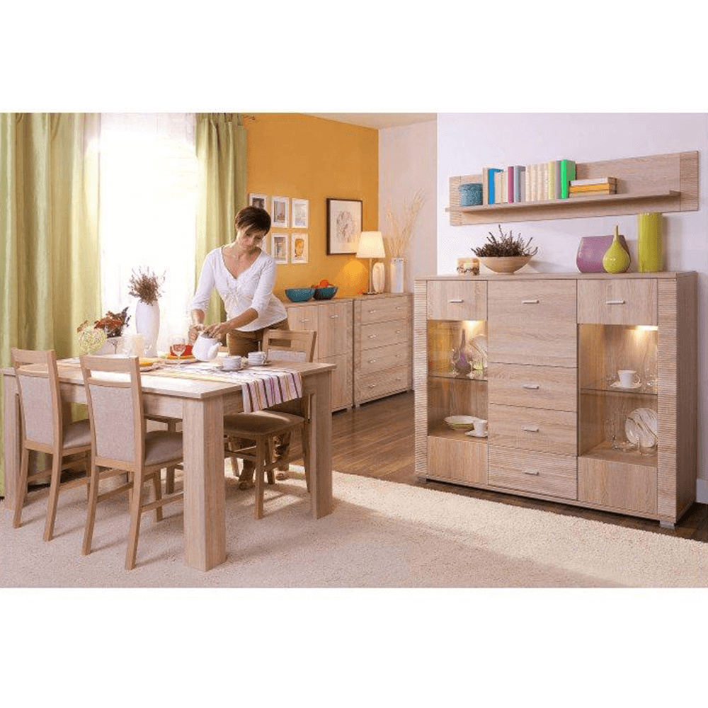 Vitrína typ 05, vhodná na zařízení obývacích pokojů, ložnic i pracoven, materiál: DTD laminovaná. Hrany jednotlivých komponentů jsou ukončeny vroubkovanou lištou. Barevné provedení: dub sonoma. Rozměry (ŠxVxH): 63x192x39 cm. Tloušťka materiálu korpus: 16 mm Tloušťka materiálu vrchní desky: 22 mm Tloušťka materiálu spodní desky: 22 mm Dodá